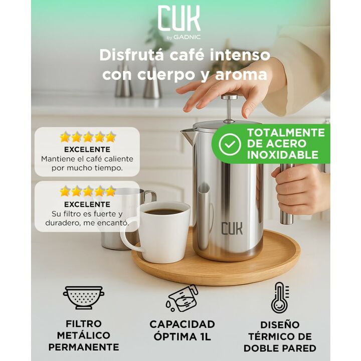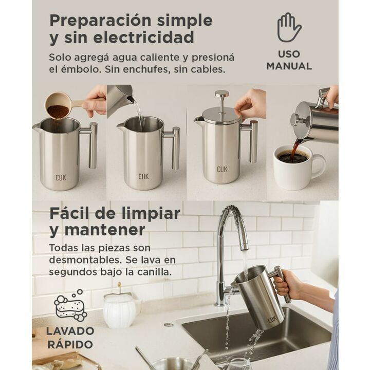 ¡Nuevo Cafetera Prensa Francesa con Función Termica! Ahora preparar tu café y conservar su temperatura es posible con un solo artefacto. La cafetera esta completamente construida en acero inoxidable y mantiene más 3hs la temperatura de tu bebida favorita Con filtro permanente incluido: La nueva pren...