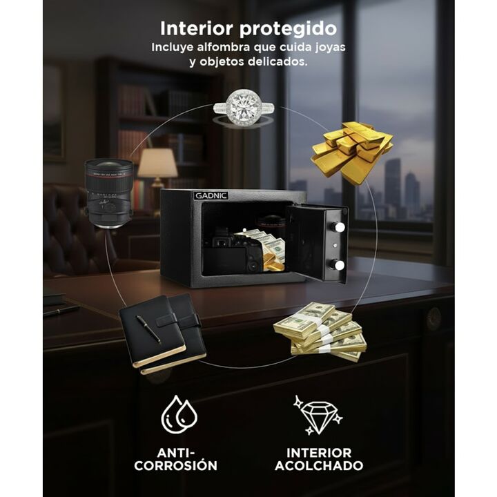 Mantené todos tus objetos de valor cuidadosamente guardados bajo llave con la caja fuerte de seguridad GADNIC. La caja fuerte, además de ser compacta, ofrece una capacidad de casi 15 litros que permite acomodar perfectamente una amplia gama de artículos, incluidos documentos legales, pasaportes, joy...