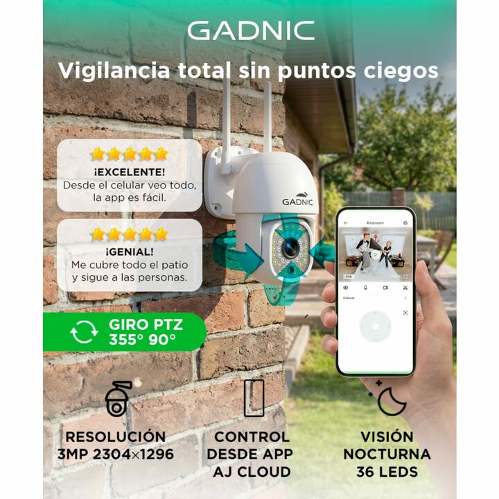 Cobertura PTZ para reducir puntos ciegos: La Cámara de seguridad Gadnic DM200W-Pro permite rotación horizontal 355° y vertical 90° para vigilar entradas, patios o veredas con un solo equipo. Ajustá el encuadre desde la app y seguí lo importante sin depender de un ángulo fijo. Imagen 3MP para ver det...