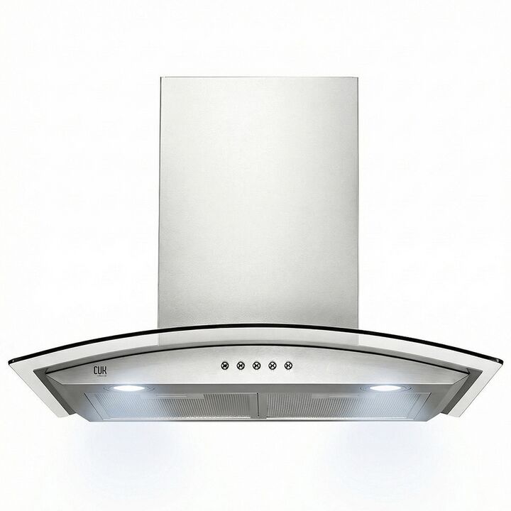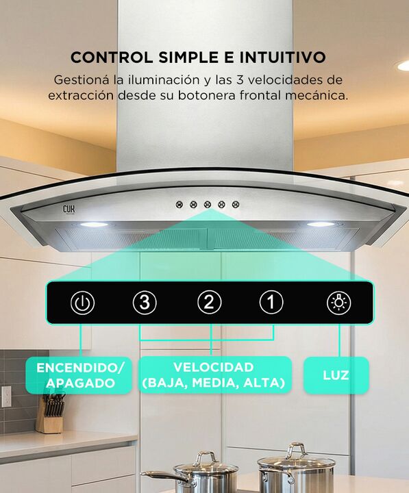 Potencia real de 750 m³/h para una cocina sin humo: La Campana Extractora CUK PURCAM01 incorpora un motor de 230W que garantiza una absorción eficiente de vapores y olores. Ideal para mantener el ambiente limpio incluso en preparaciones intensas. Diseño curvo de vidrio templado y acero inoxidable: S...