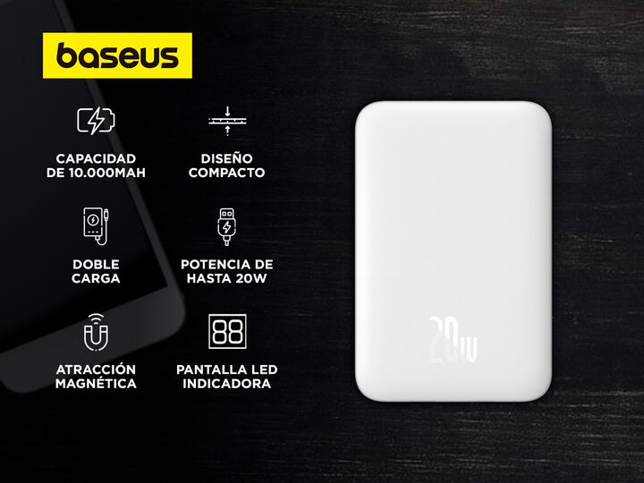 Descubrí el Power Bank Baseus, la solución definitiva para carga rápida y versátil. Con capacidad de 10000mAh, este power bank ofrece carga inalámbrica y por cable 2-en-1, con soporte para carga rápida de 20W. Su innovador diseño de carga magnética te permite conectar y empezar a cargar al instante....
