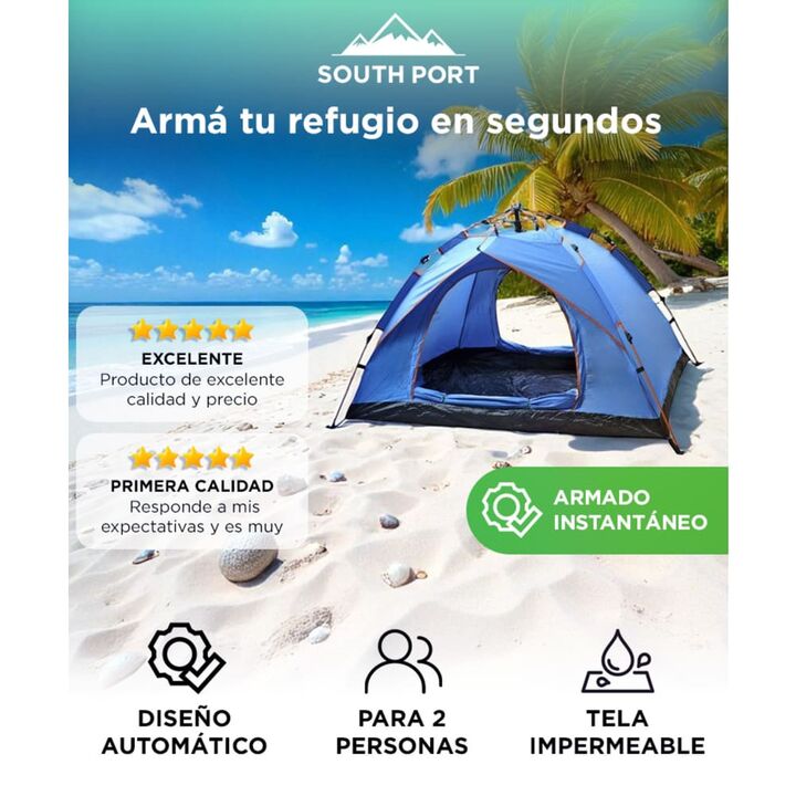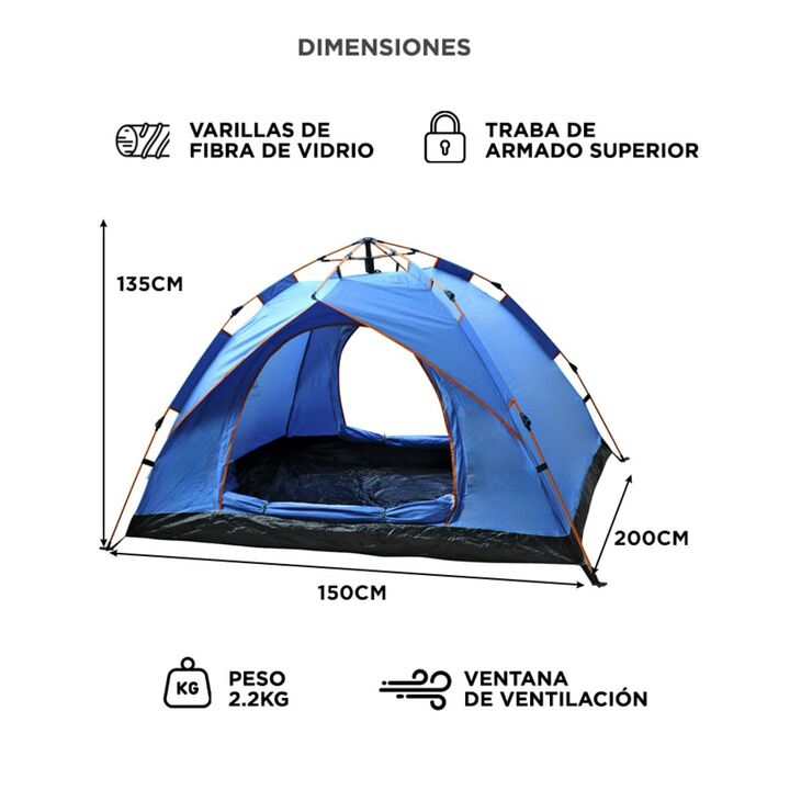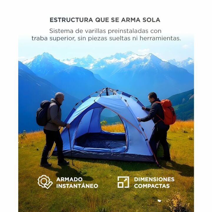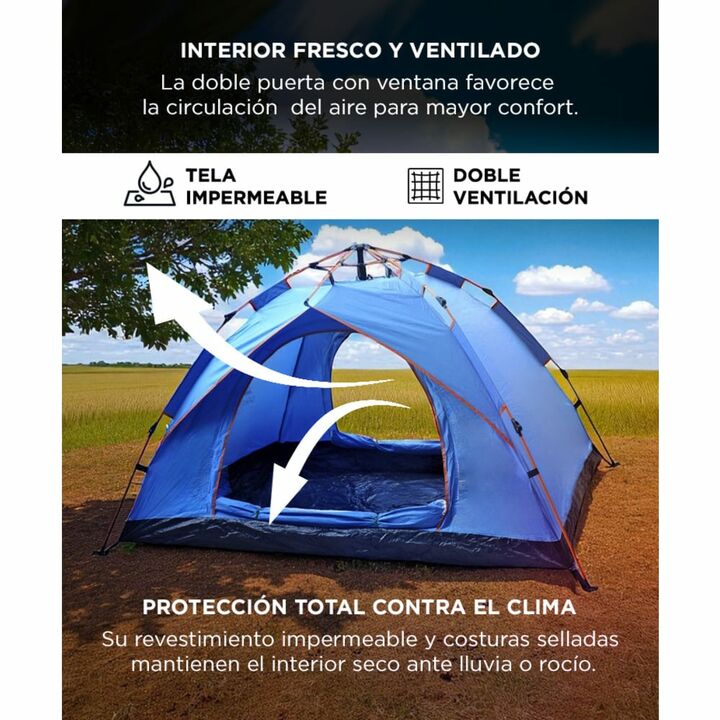 Armado en segundos sin esfuerzo: Gracias al sistema automático con traba superior, podés montar la carpa en tiempo récord sin herramientas. Protección contra el viento y la lluvia: Tela impermeable y estacas de acero incluidas para asegurar firmeza incluso en condiciones exigentes. Comodidad para do...