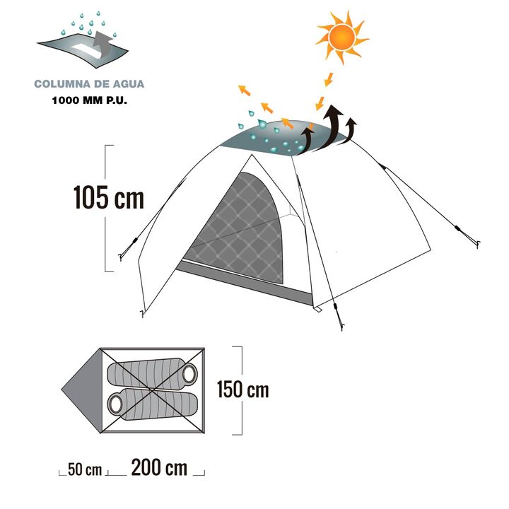 Tejido exterior Polister 190T aluminizado.-Tejido interior Polister 170T respirable.-Piso Polietileno 100 PE SHEET 12x10 130gm2-Columna de Agua 1000 mm P.U.-Estructura Fibra de vidrio 7.9 mm.-Mosquitero Poly Mesh No See Um.-Costuras reforzadas termoselladas.-Tratamiento U.V. Protection.-Mltiples ent...