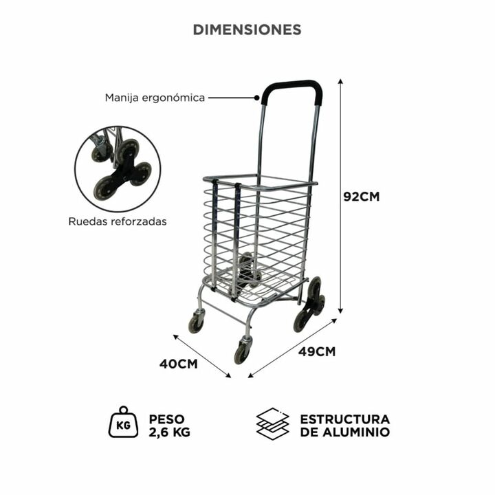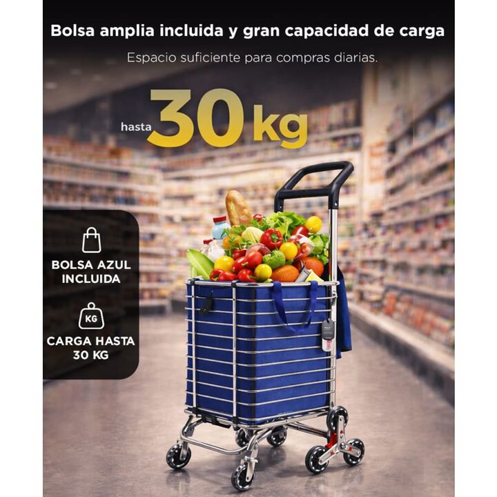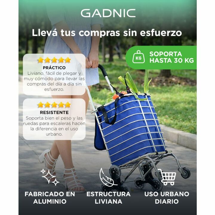 Compras sin esfuerzo todos los días El carrito de compras Gadnic permite transportar hasta 30 kg de forma cómoda, reduciendo el esfuerzo al cargar bolsas en recorridos urbanos y compras frecuentes. Ruedas diseñadas para escaleras Incorpora un sistema de ruedas múltiples que facilita subir y bajar es...