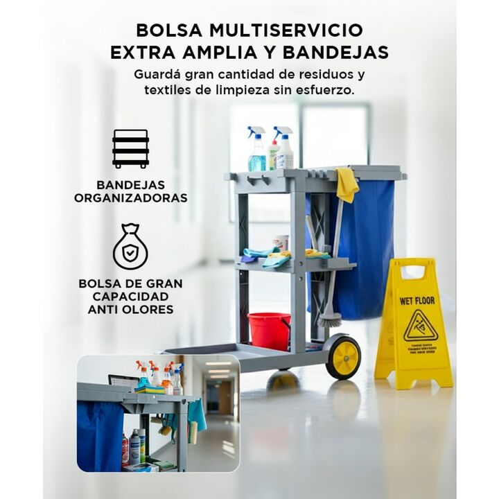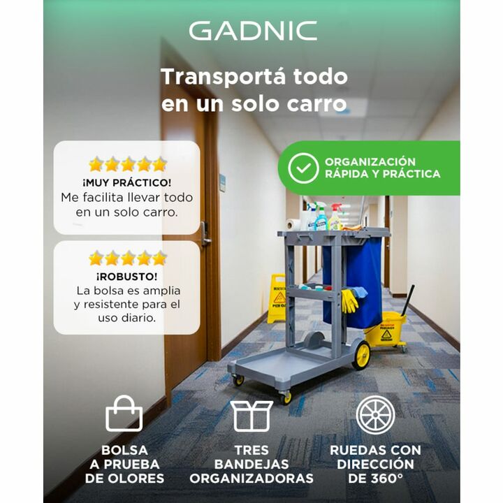 Optimiza la limpieza con el Carro de Limpieza Multiservicio Gadnic, diseñado para proporcionar comodidad y eficiencia en la gestión de implementos de limpieza. Fabricado con material PP de alta calidad, garantiza durabilidad, resistencia a la corrosión y antienvejecimiento, asegurando un uso prolong...