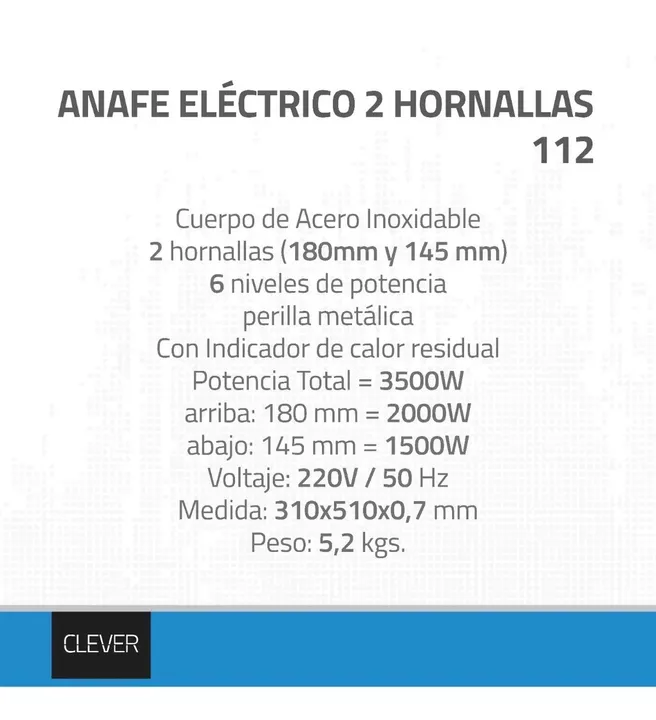 Descubre el Anafe Eléctrico 2 Hornallas Clever 112, una opción ideal para quienes buscan eficiencia y estilo en la cocina. Fabricado en acero inoxidable, este anafe no solo es duradero, sino que también aporta un toque moderno a tu espacio. Con dos hornallas de diferentes tamaños, 180 mm y 145 mm, p...