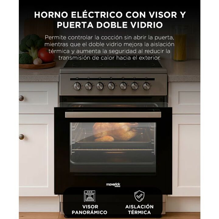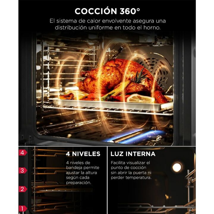 Cocción Envolvente 360°: El horno distribuye el calor de manera uniforme en todo el interior, logrando cocciones más parejas y eficientes. Ideal para preparaciones que requieren temperatura estable como pastelería, carnes o vegetales asados. 4 Niveles de Cocción Ajustables: Ofrece cuatro posiciones ...