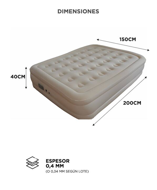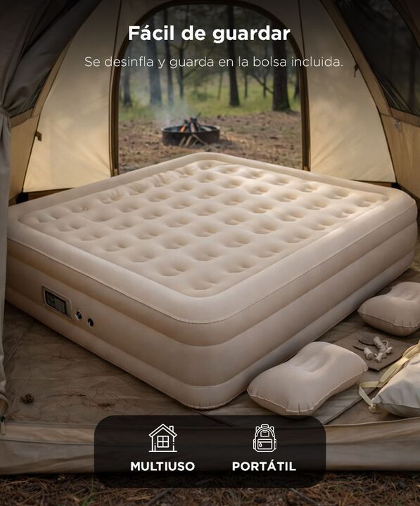 Comodidad real para dos personas El colchón inflable CAMP0147 ofrece dimensiones amplias de 200 × 150 cm, ideal para dormir cómodamente dos adultos. Altura elevada tipo cama tradicional Con 40 cm de altura, brinda mayor confort y aislamiento del suelo en interiores o exteriores. Inflado rápido con b...