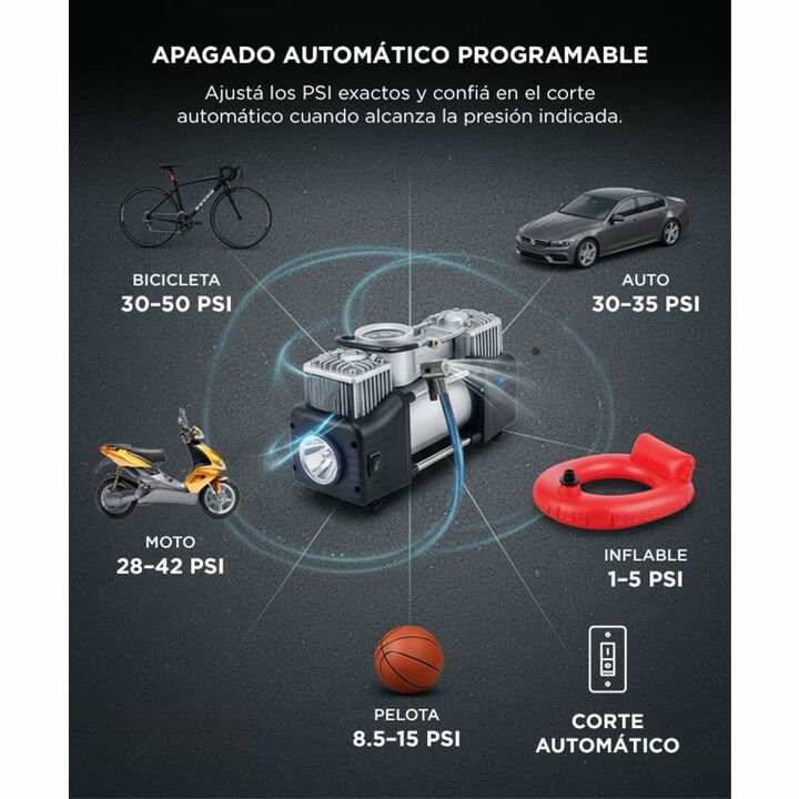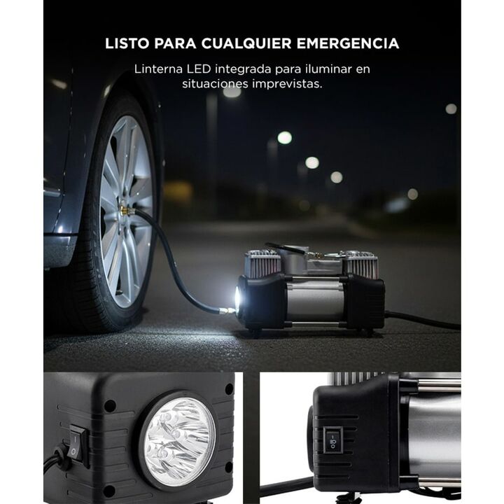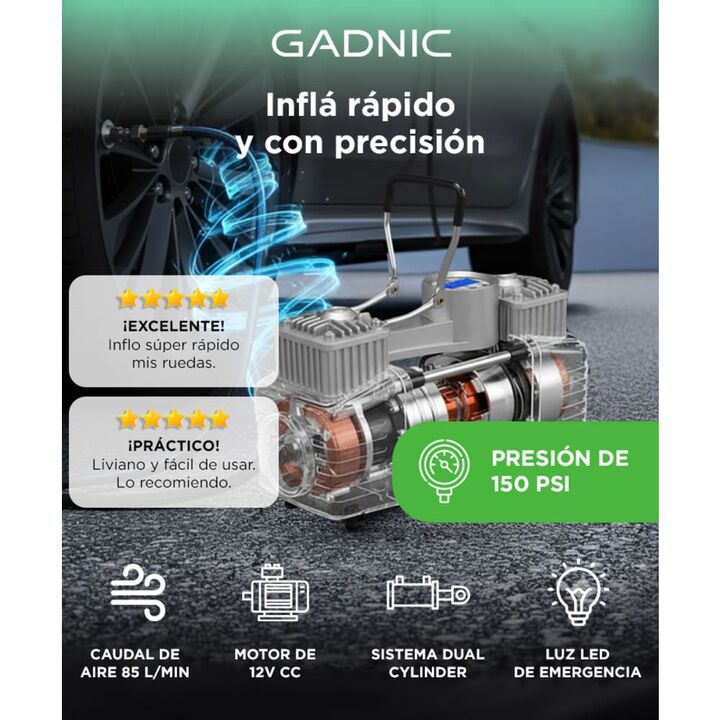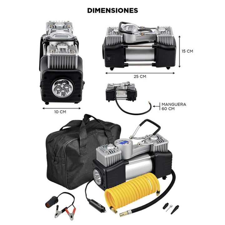 Nuevo Compresor 12V Doble Cilindro By Gadnic Ideal para todo tipo de vehículos, 4x4, botes, camping, bicicletas, autos. Su uso puede ser domestico o industrial, es fácil de transportar y posee una presión máxima de 150 psi Multipropósito Pensado para ser un dispositivo eficiente, este compresor incl...