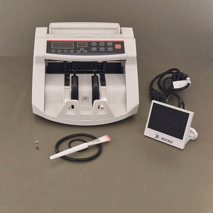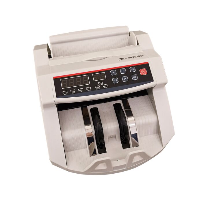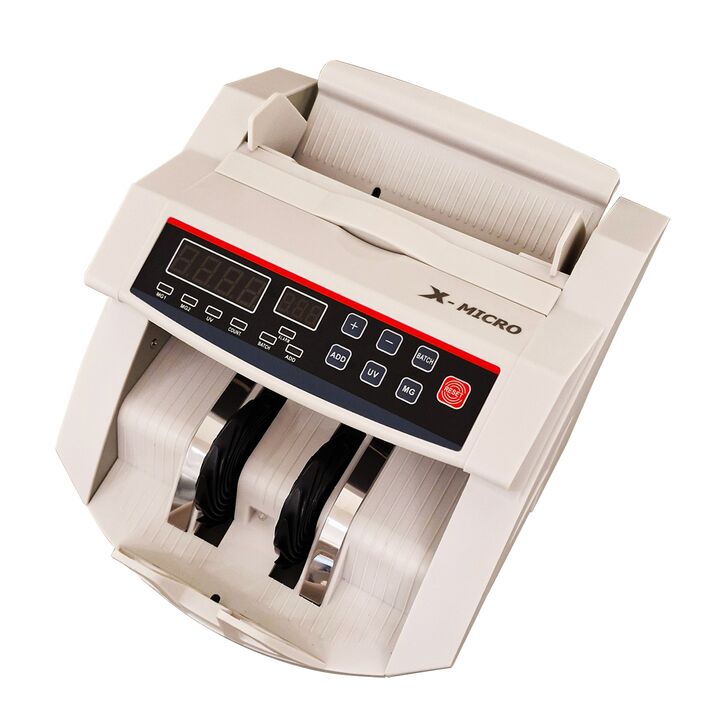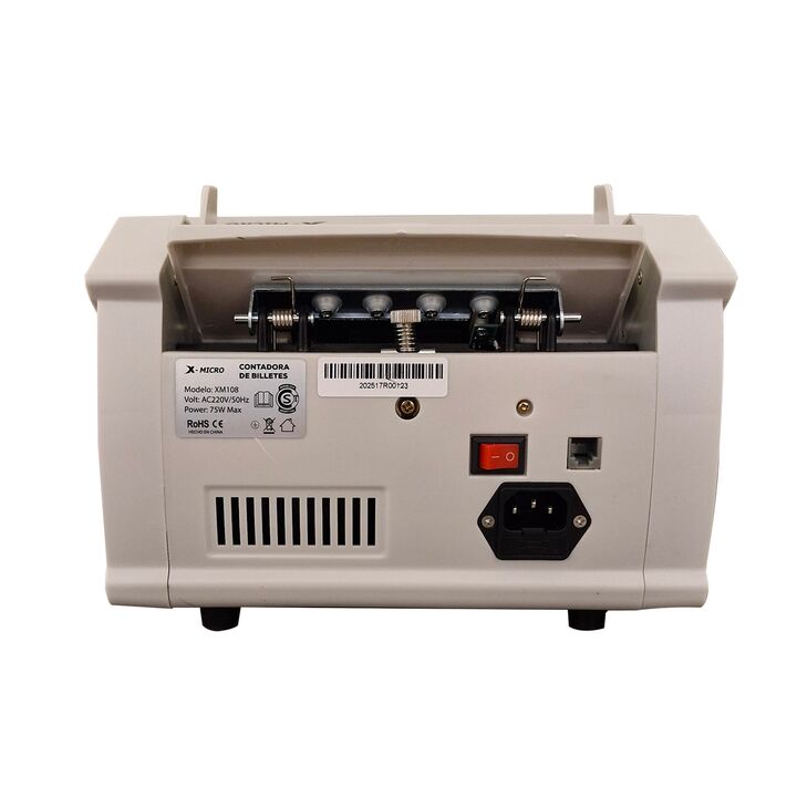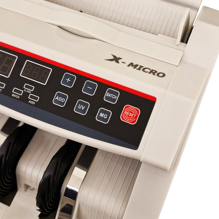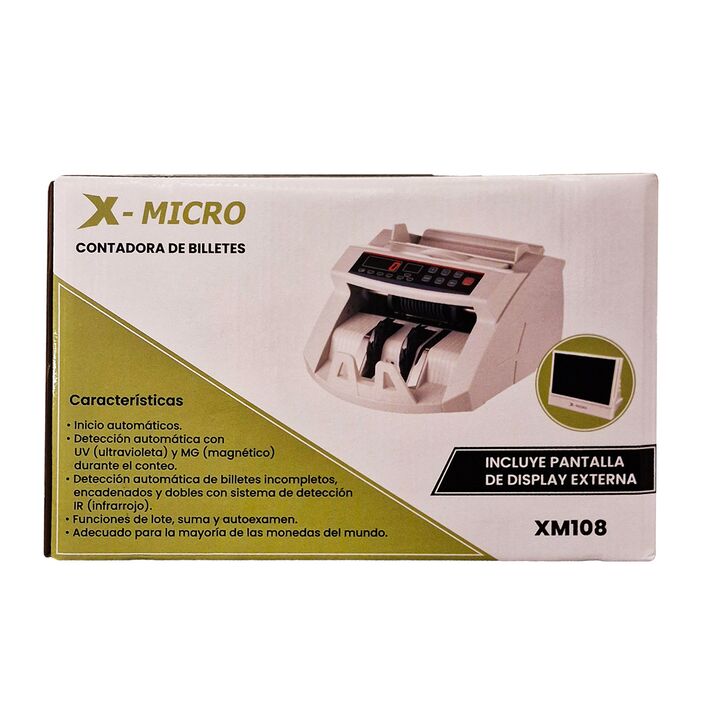 Contadora De Billetes X-Micro XM108 Características - Inicio, parada y compensación automáticos - Detección de billetes falsos mediante UV, MG e IR durante el conteo - Con adición por lotes y detección automática de billetes de medio dólar - Compatible con USD, EUR y la mayoría de las divisas intern...