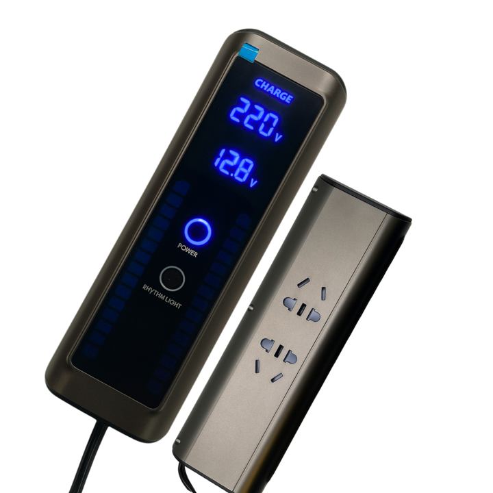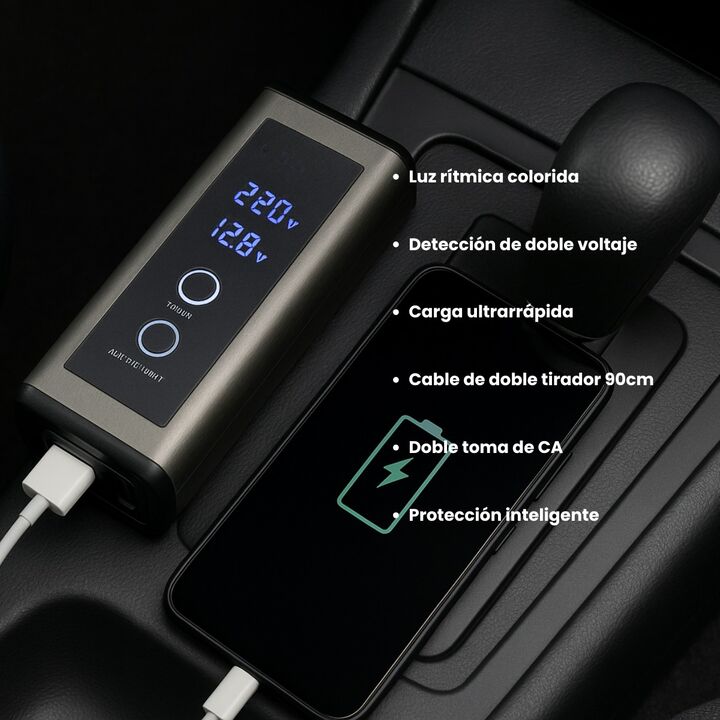Voltaje de entrada 12v24v y 25 AVoltaje de salida 220v y 50 Hz. Potencia de salida CA 300W. Puerto USB A y C. Cable cargador