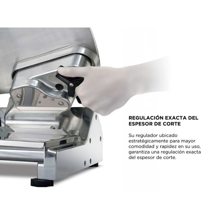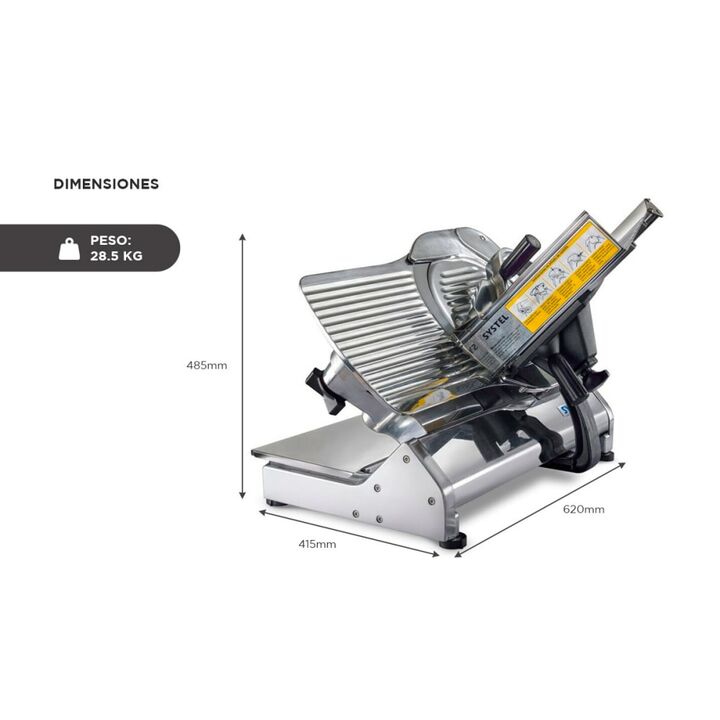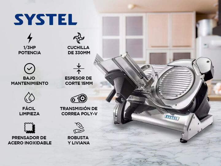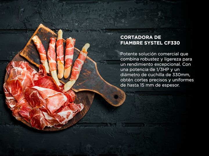 Descubre la cortadora de fiambre Systel CF330, una potente solución comercial que combina robustez y ligereza para un rendimiento excepcional. Con una potencia de 1/3HP y un diámetro de cuchilla de 330mm, obtén cortes precisos y uniformes de hasta 15 mm de espesor. Su diseño inteligente incluye un r...