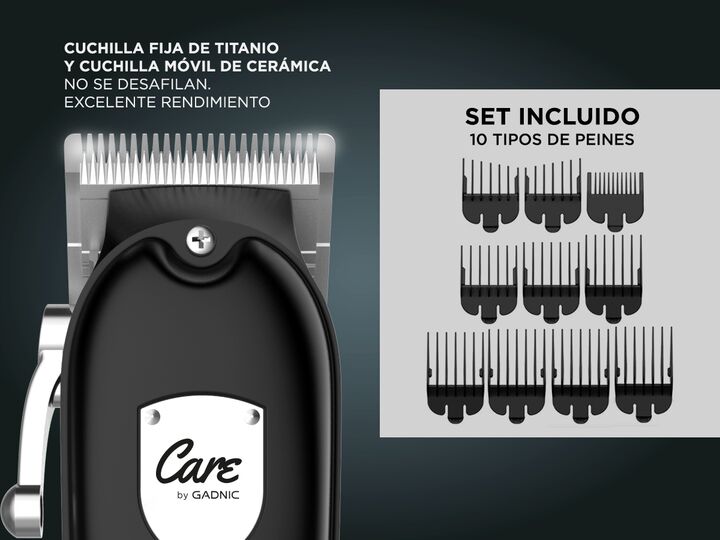 Especificaciones Maquina De Pelo Care By Gadnic CP8000 Profesional 10 Peines + Accesorios - CORTPE08 Cortadora inalámbrica recargable Peso ligero y uso muy tranquilo Batería de iones de litio Mango ergonómico Hoja super afilada Cuchilla ajustable Super silenciosa Batería: 2600 mAh Velocidad del moto...