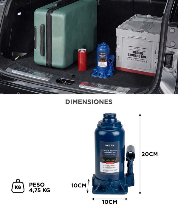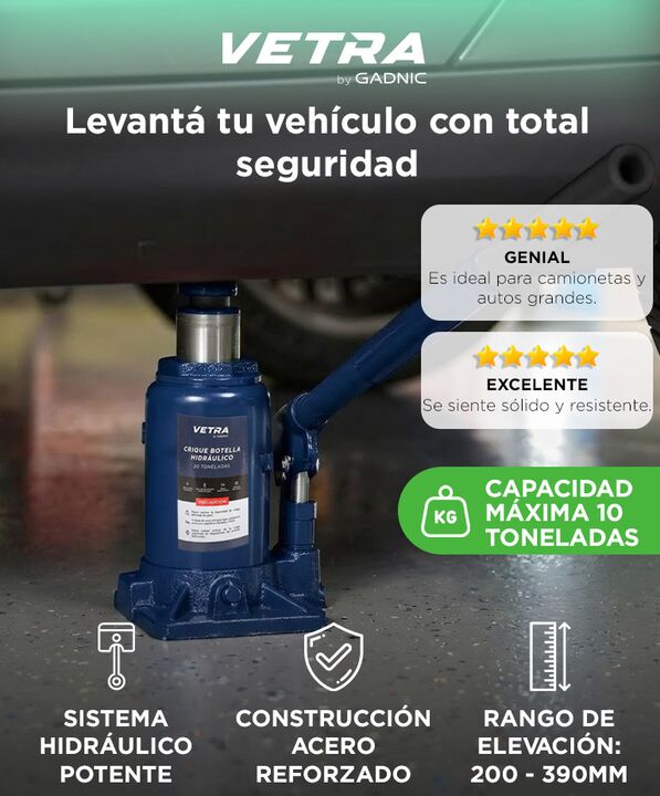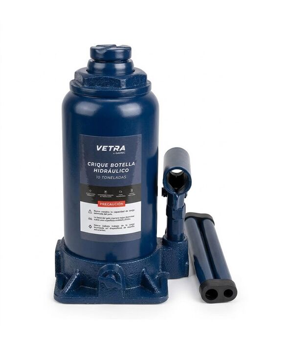 Elevación potente para vehículos pesados: El crique botella Vetra ofrece una capacidad de carga de hasta 10 toneladas, permitiendo levantar autos, camionetas y utilitarios con total seguridad. Sistema hidráulico eficiente: El sistema hidráulico proporciona una elevación potente con menor esfuerzo, f...