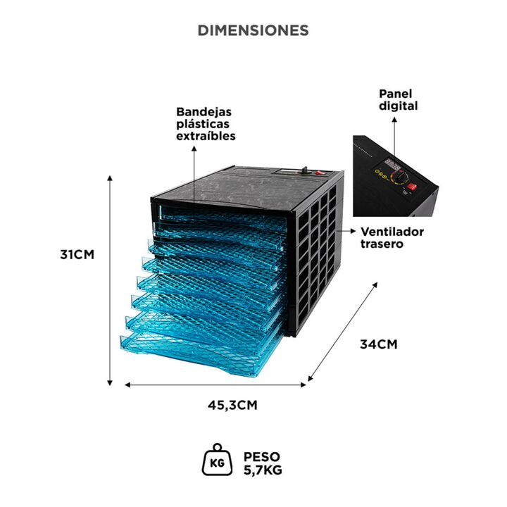 La deshidratadora de alimentos es una herramienta esencial para aquellos que buscan conservar sus alimentos de manera saludable y duradera. Con ocho bandejas, esta deshidratadora permite procesar grandes cantidades de alimentos en poco tiempo. Además, cuenta con un panel de control que incluye un in...