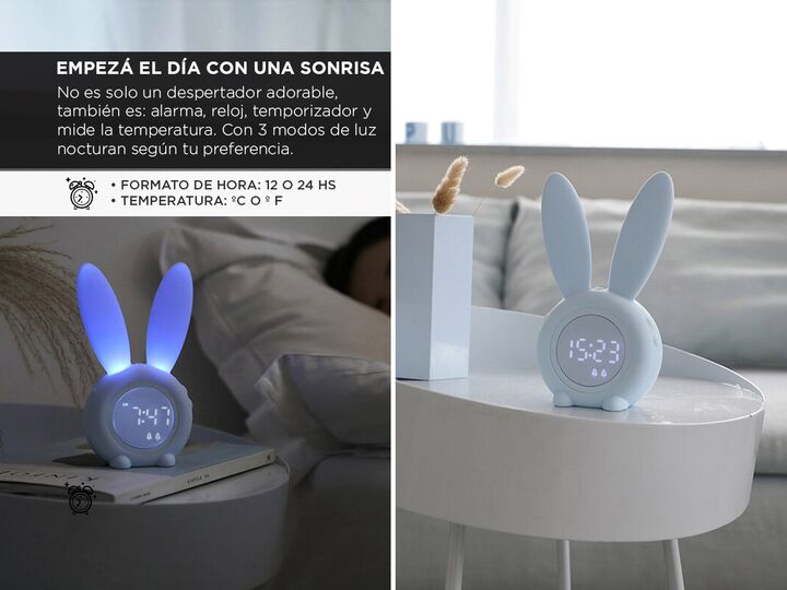 Despierta cada mañana con una dosis de encanto y alegría gracias a nuestro Despertador de Conejo. Con una batería de larga duración, puedes confiar en que te despertará a tiempo todos los días. Configura hasta 2 alarmas con una selección de 6 tonos de llamada y ajusta el volumen según tus preferenci...