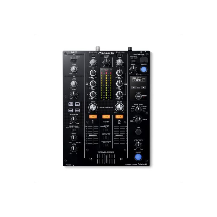 Mixer | Dj | 2 Chs | Sound Color FX | Beat FX | Crossfader Magvel | Entradas 3 Line (RCA) 2 Phono (RCA) 1 Mic (Jack 1/4) | 2 Puertos USB A-B | Salidas 1 Master (XLR-RCA) 2 Monitores de Audifonos | Incluye software Rekordbox
