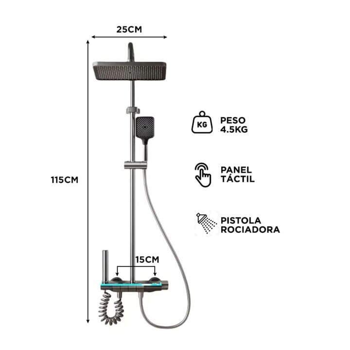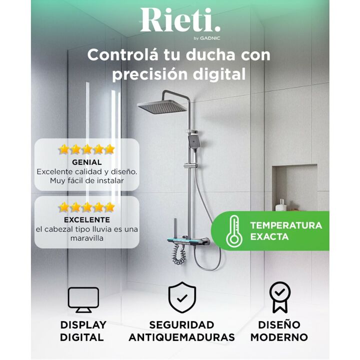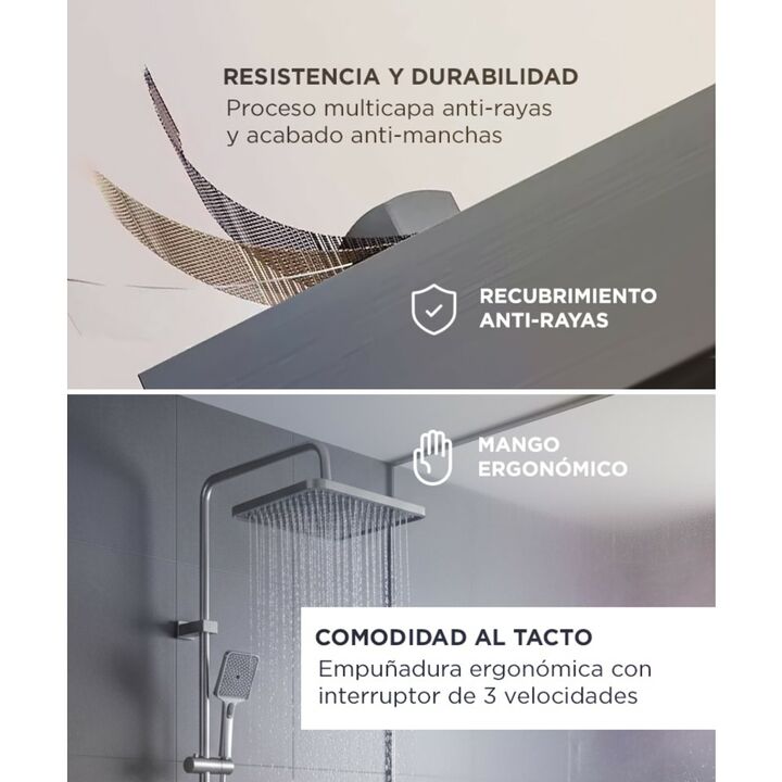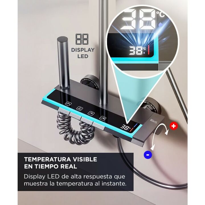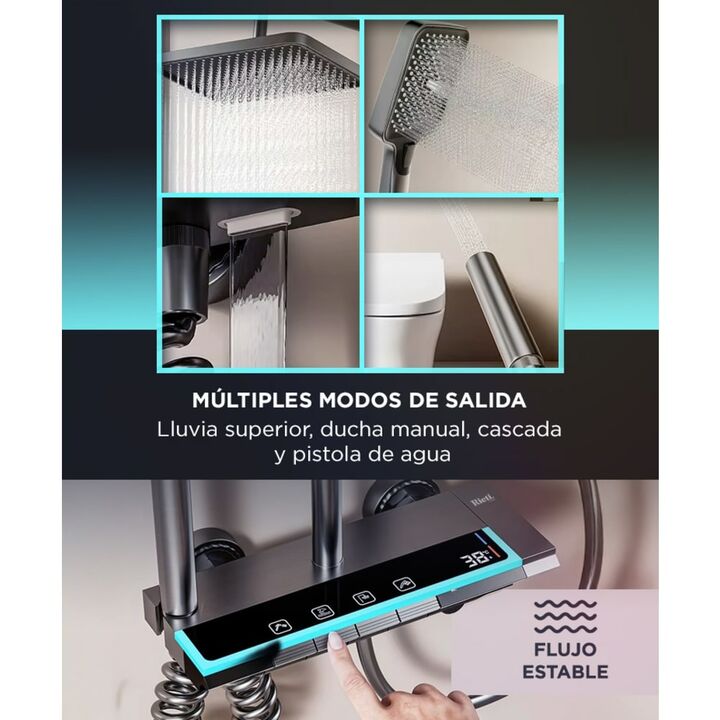 Control digital inmediato: Display LED de alta velocidad que muestra la temperatura en 0,1 segundos, ideal para duchas seguras. Diseño resistente y moderno: Vidrio templado nano y acero inoxidable con recubrimiento anti-manchas y rayaduras. Experiencia de ducha completa: Cuatro modos de agua (lluvia...