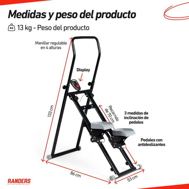 ESCALADORA VERTICAL ARG-914 Escaladora vertical de entrenamiento Randers Un solo equipo, muchísimas posibilidades. Ideal para ejercitar todo el cuerpo, mejorar la resistencia y quemar calorías. Combiná movimientos de escalada y step en un entrenamiento dinámico, efectivo y fácil de usar. ✔ Ajustá la...