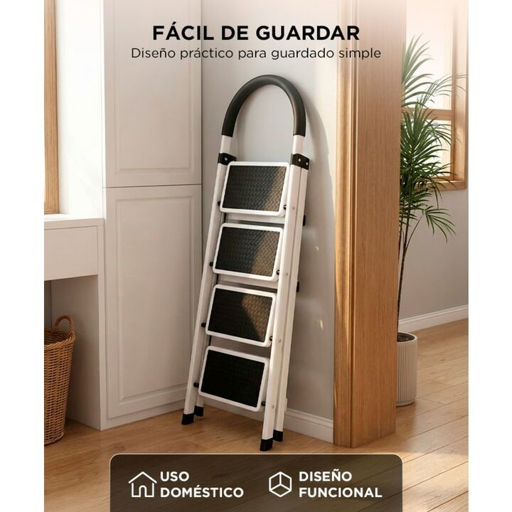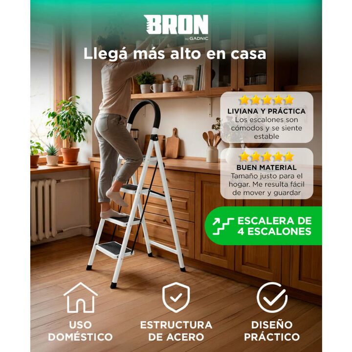 Cuatro escalones para tareas del hogar: La escalera Bron by Gadnic de 4 escalones permite alcanzar estantes, alacenas y zonas altas de forma cómoda en el hogar. Estructura de acero resistente: Fabricada en acero, ofrece una construcción sólida pensada para un uso doméstico frecuente y mayor durabili...