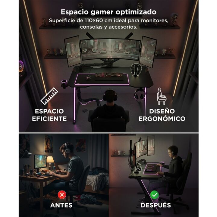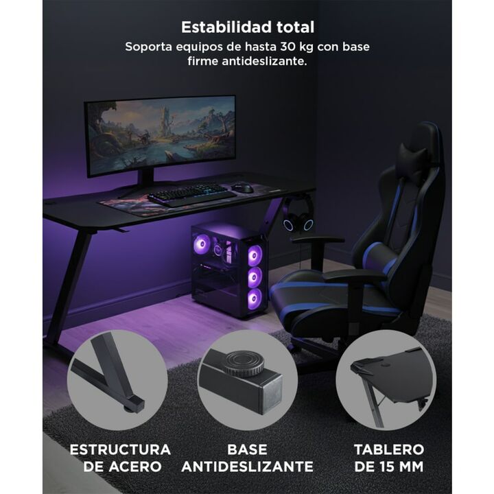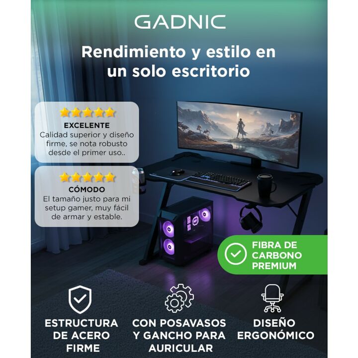 ¡Introducí un nuevo nivel de juego con nuestro escritorio gamer de alta calidad! Construido con materiales de primera calidad, nuestro escritorio está diseñado para proporcionar resistencia, durabilidad y estilo. El tablero de fibra de carbono ofrece una superficie espaciosa y resistente para tus eq...