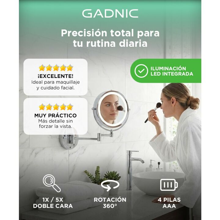 ¡Gadnic presenta su nueva linea de Espejo Led de pared para maquillar! Este espejo de maquillaje montado en la pared cuenta con un diseño de espejo doble que se puede girar 360 grados para satisfacer sus necesidades en diferentes ángulos, lo que le brinda una experiencia de maquillaje rápida y fácil...