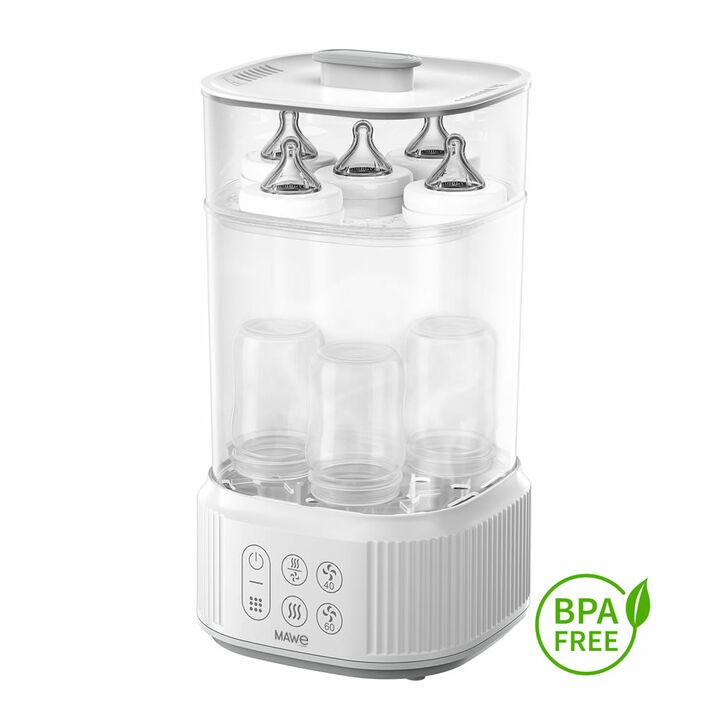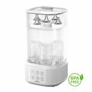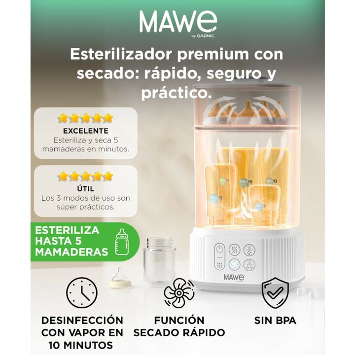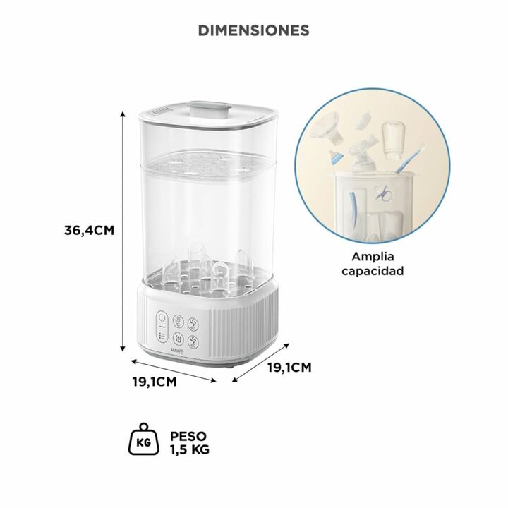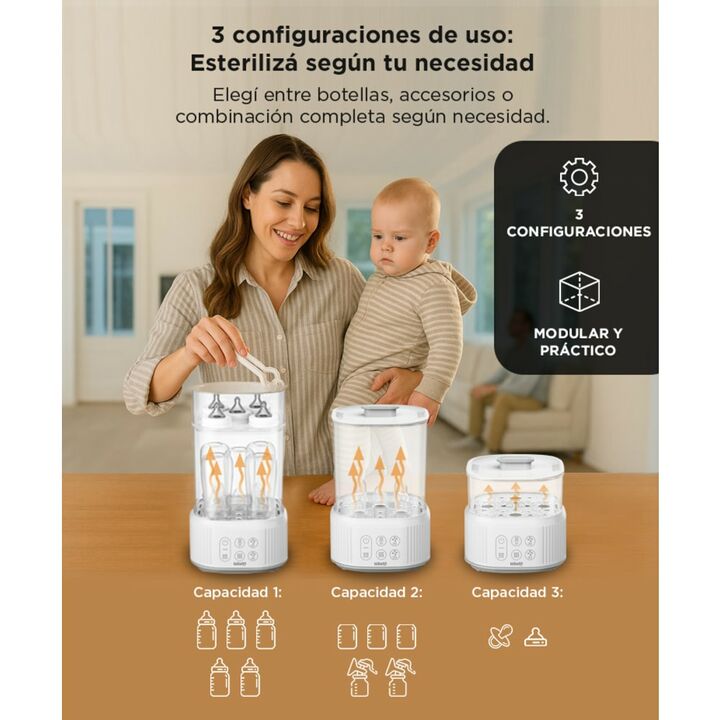 Gran capacidad para 5 mamaderas Esterilizá hasta cinco biberones al mismo tiempo. Ideal para familias que necesitan practicidad y rapidez en el día a día. Esterilización rápida y segura Eliminá 99,9% de gérmenes en solo 10 minutos con vapor a 100 °C, sin químicos ni productos adicionales. Función 3 ...