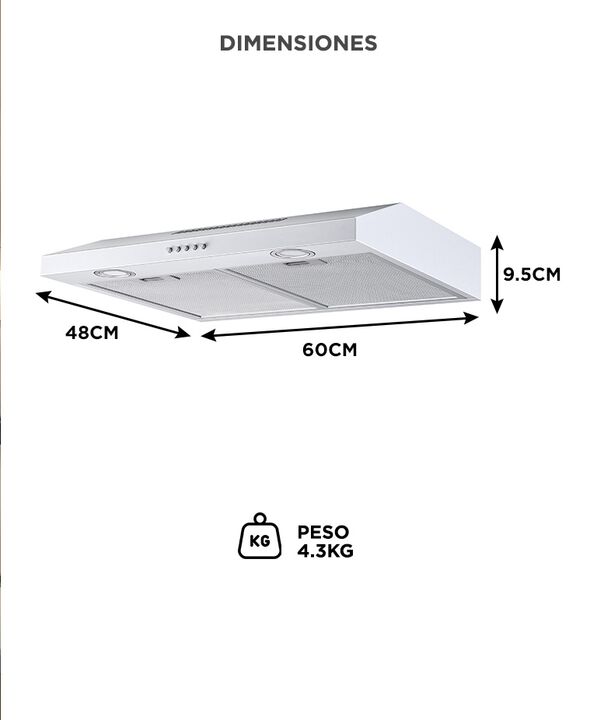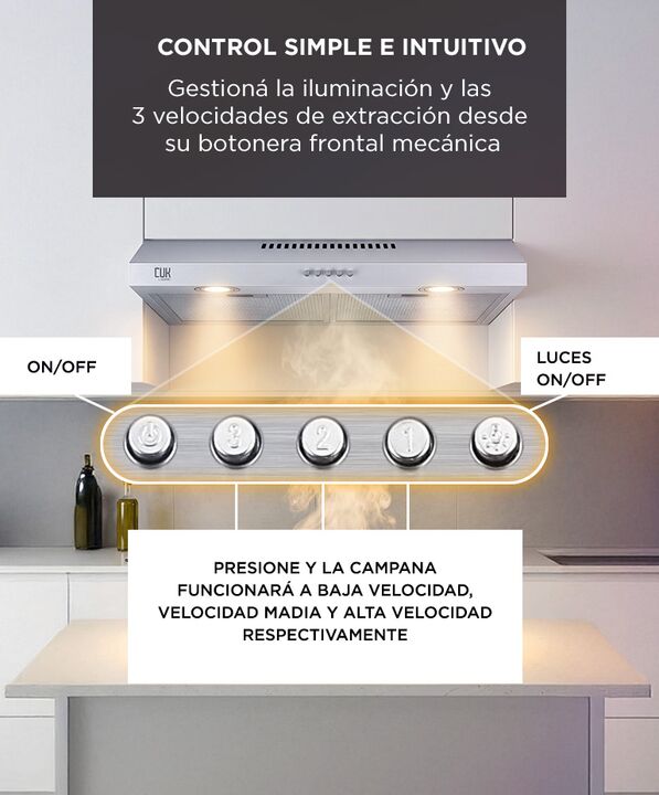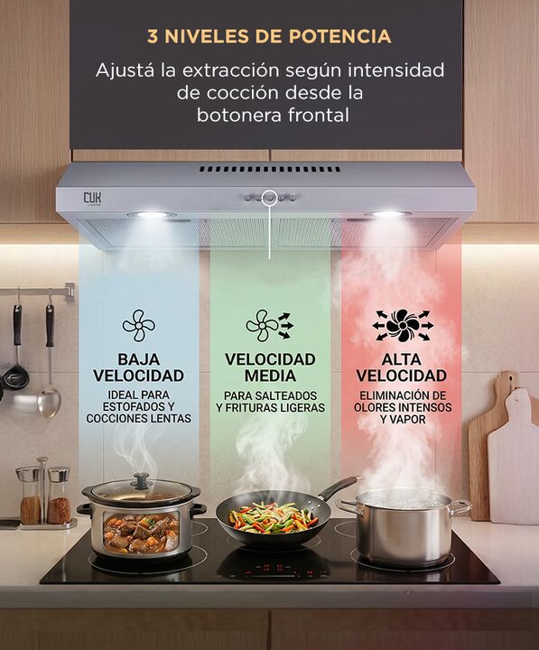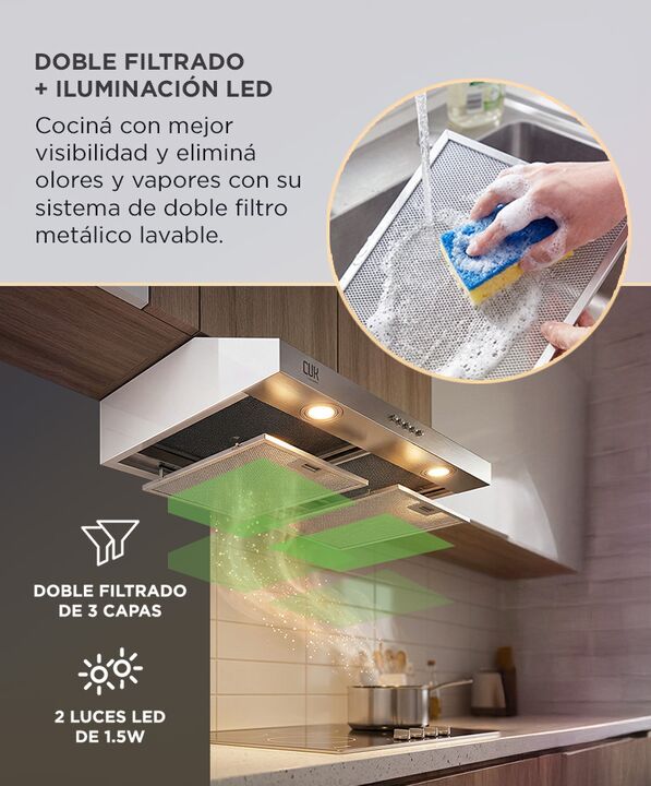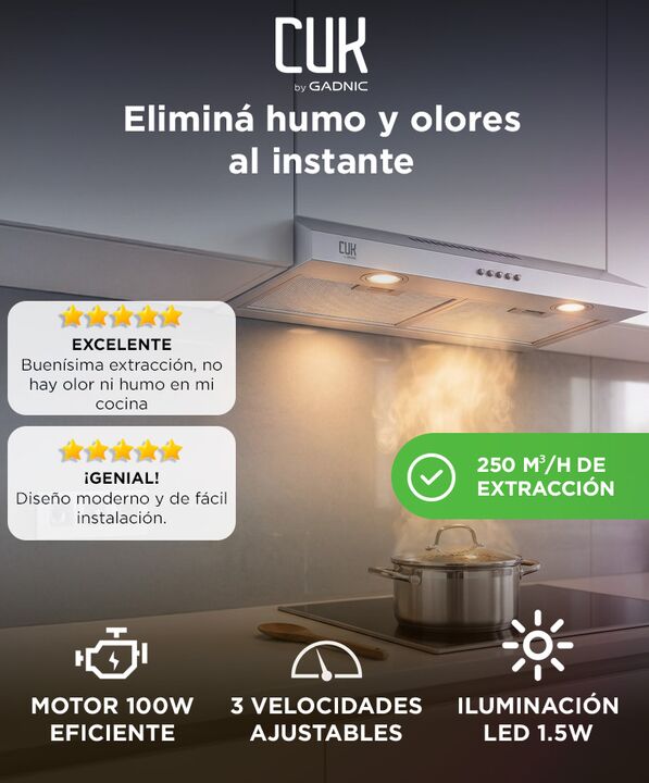 Potencia real de extracción 250 m³/h: El extractor CUK by Gadnic EXT21450 elimina humo, grasa y olores con flujo de aire de 250 m³/h, ideal para cocinas domésticas medianas. Doble sistema de filtrado eficiente: Incluye 2 filtros de aluminio de 3 capas lavables y filtro de carbón para uso con o sin s...