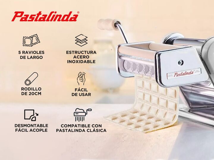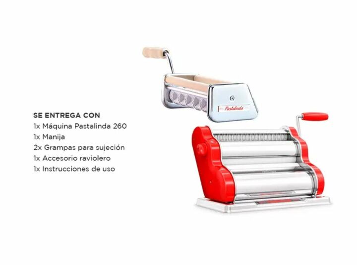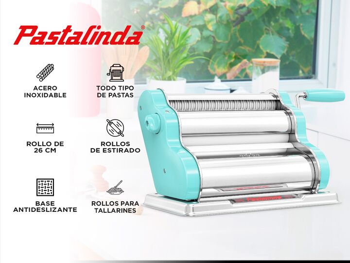 Pastalinda Clásica 260 Máquina elaboradora de Pasta Casera. Fácil de usar, de elegante diseño y mayor tamaño. Permite preparar mayor cantidad de pasta en menor tiempo. Amasa y estira todo tipo de pasta. Podés preparar tallarines, espaguetis y hojas de masa para lasañas,canelones, ravioles, sorrentin...