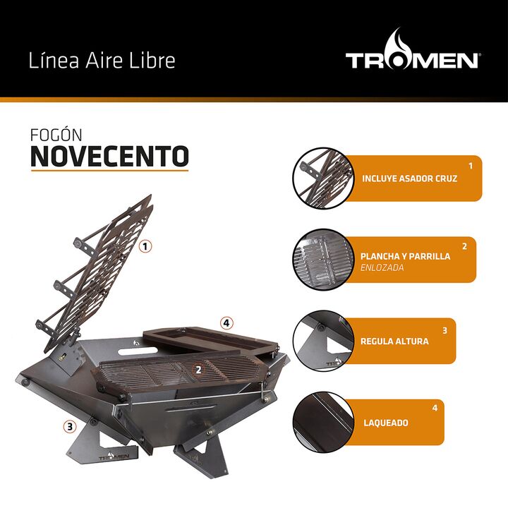 Un fuego super prctico. Cuenta con parrilla plancha y asador mvil.El fogonero novecento est diseado para poder utilizarse en dos alturas distintas. MEDIDASANCHO Diametro 90cmALTO 73.5con asadorDoble altura 32cm y 40cmACCESORIOS Asador-Parrilla y plancha enlozada
