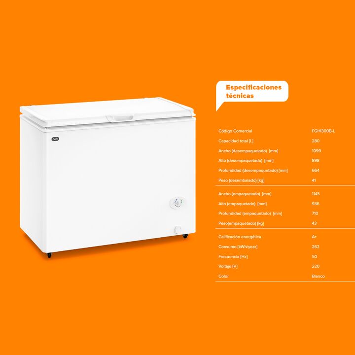 Freezer Horizontal Gafa Blanco Inverter 280lts - FGHI300B-L Conservá alimentos, bebidas y envases de todo tamaño, de forma práctica y organizada, con el Freezer Horizontal Gafa FGHI300B-L Blanco con 280L de capacidad. Cuenta un Motor con tecnología inverter*, con 10 años de garantía, que mantiene la...