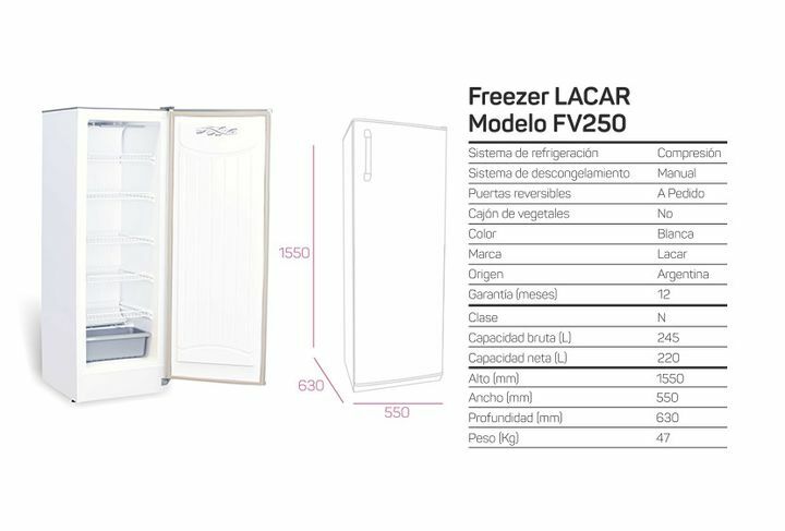 CARACTERISTICAS TcnicasTipo de FreezerTipo VerticalCapacidad Bruta245 Ltrs.Capacidad Neta220 Ltrs.DesagoteNoMedidasAlto 154 cm x Ancho 54 cm x Profundidad 63 cmRuedasNoNO FROSTNoCaracteristicas Adicionales5 Estantes Termostato Sistema de refrigeracin a compresin Sistema de descongelamiento manua...