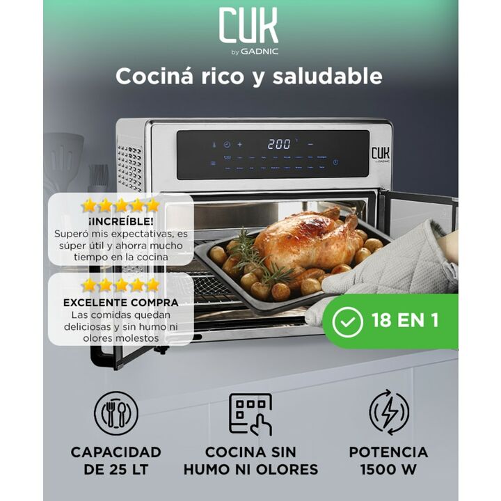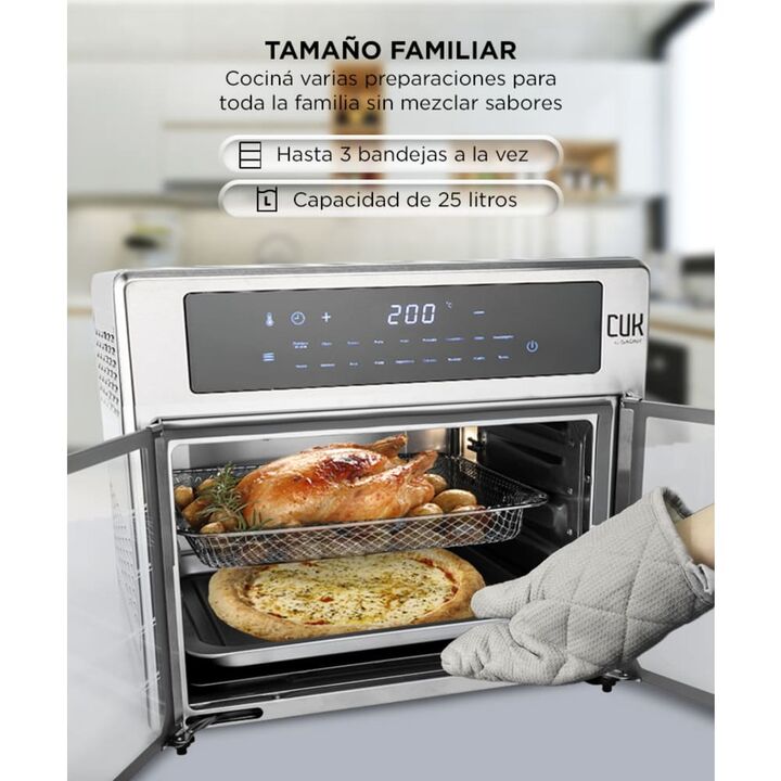 Gran capacidad de 17 litros: Cociná porciones familiares en una sola tanda. Ideal para pollo, pizzas, papas y más sin complicaciones. Tecnología de circulación de aire caliente: Lográ resultados crocantes y sabrosos con poco o nada de aceite. Disfrutá comidas más saludables todos los días. Múltiples...