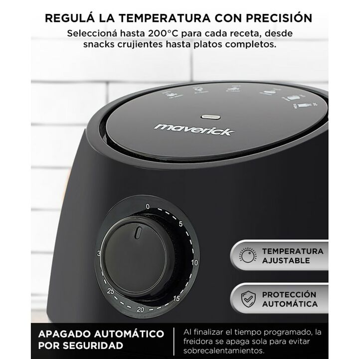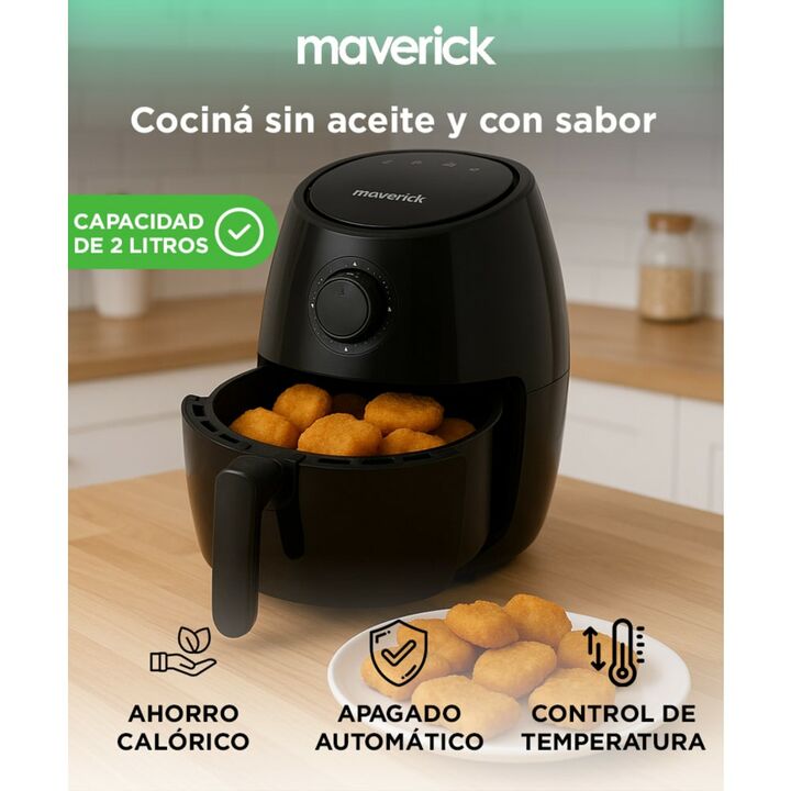Cocción saludable sin aceite: Prepará tus comidas favoritas con hasta un 80% menos de grasa, conservando el sabor y la textura crujiente. Capacidad de 2 litros: Ideal para porciones individuales o parejas. Perfecta para cocinas chicas o como complemento a otros electrodomésticos. Timer de hasta 30 m...