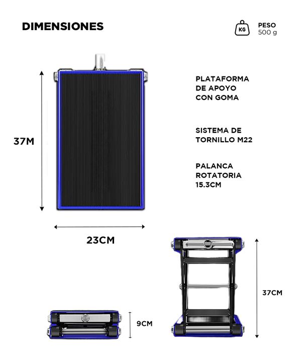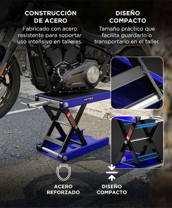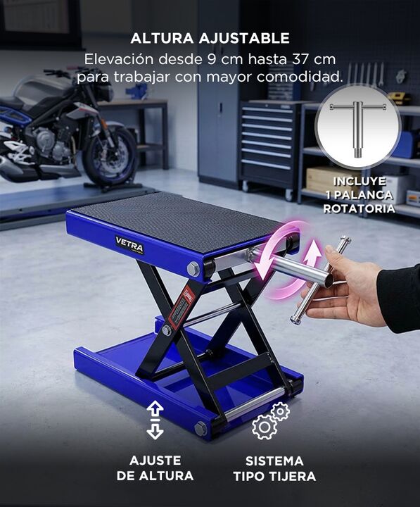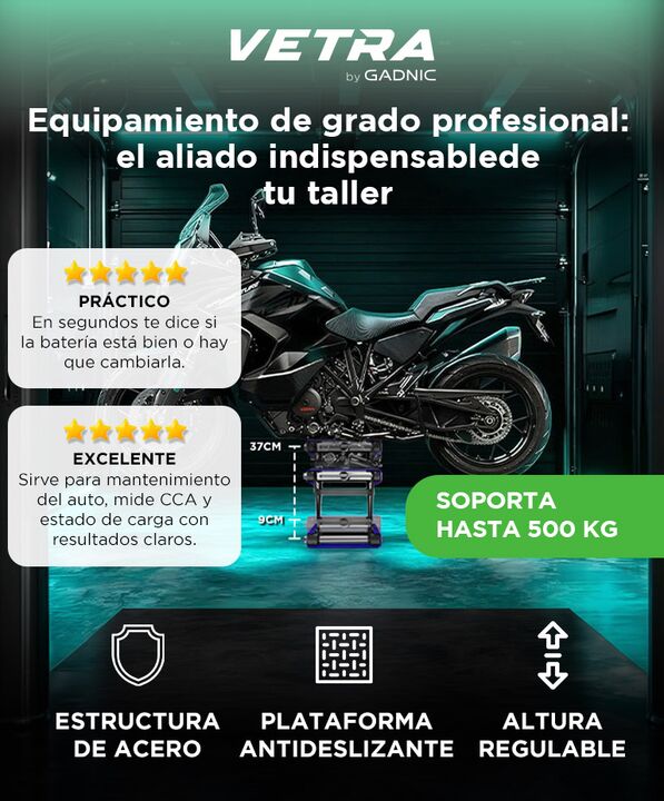 Elevación segura para mantenimiento de motocicletas La Tijera Elevadora de Motocicletas Vetra by Gadnic permite levantar motos de hasta 500 kg con estabilidad y control. Resulta ideal para tareas de mantenimiento, limpieza o reparación sin necesidad de grandes equipos de taller. Sistema de elevación...