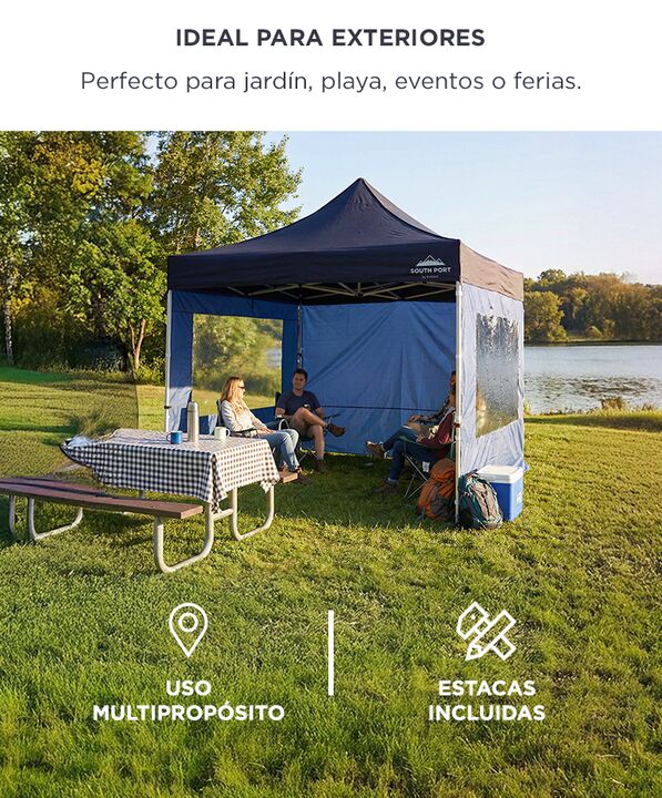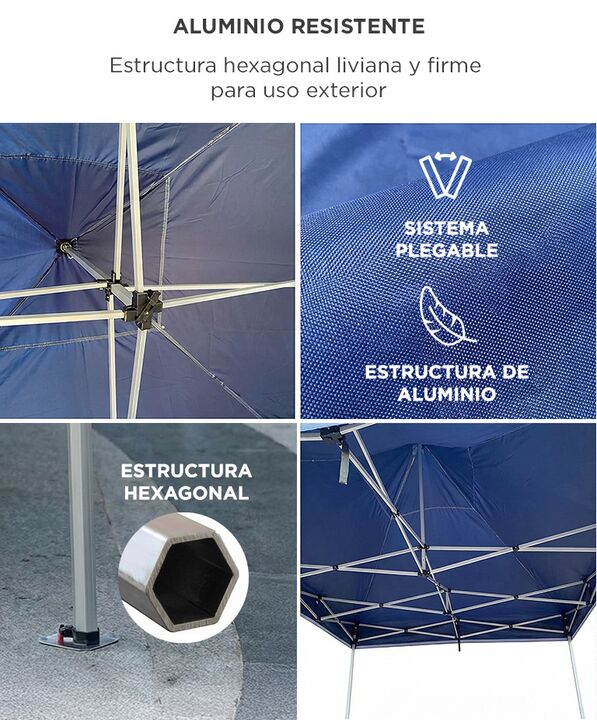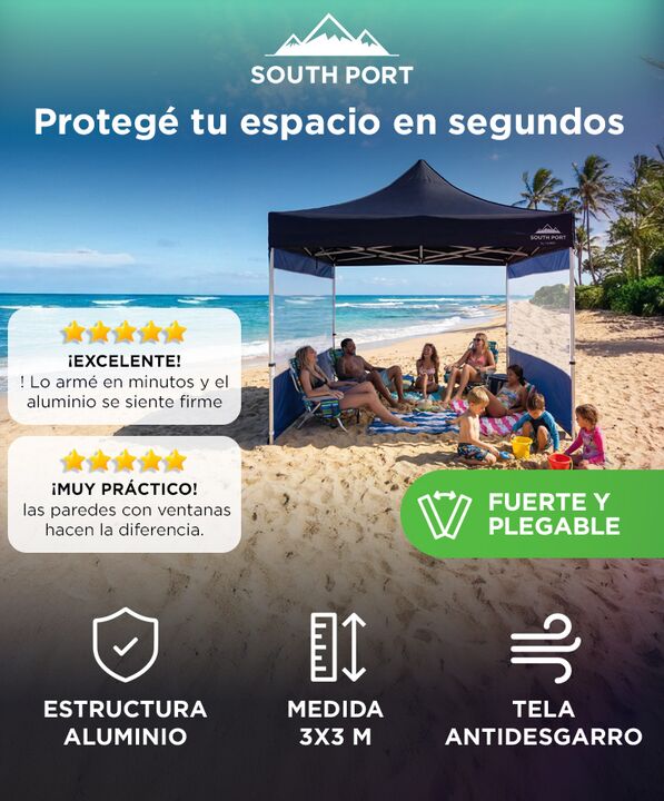 Estructura de aluminio plegable y resistente: El gazebo South Port 3x3 cuenta con estructura de aluminio hexagonal que ofrece firmeza y menor peso, facilitando el traslado y el armado en exteriores. Cobertura amplia de 3x3 metros: Brinda un espacio cómodo para reuniones, eventos o uso recreativo, pe...