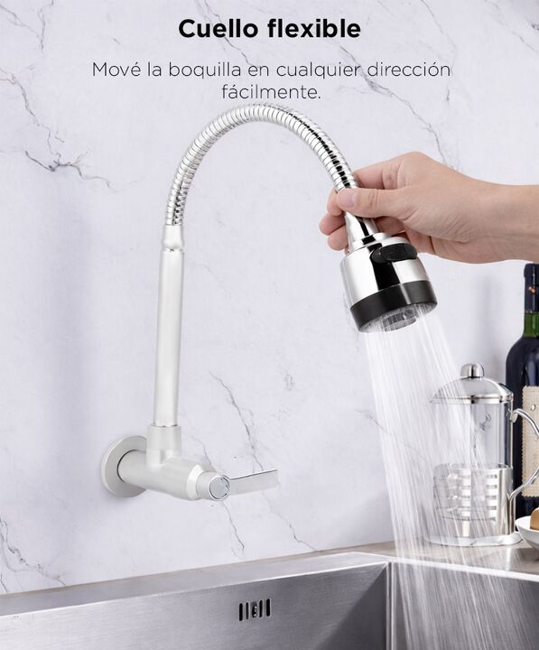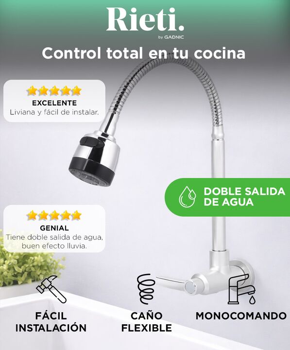 Doble salida de agua para mayor versatilidad: La grifería Rieti by Gadnic permite alternar entre modo lluvia y chorro directo según la necesidad. Mejora la experiencia diaria de lavado. Cuello flexible 360° para mejor alcance: Mové la boquilla hacia donde la necesites, facilitando la limpieza de ute...