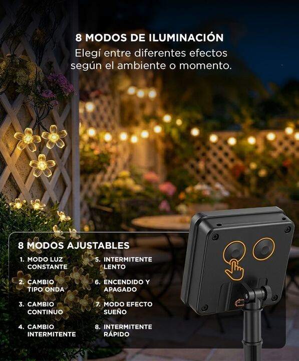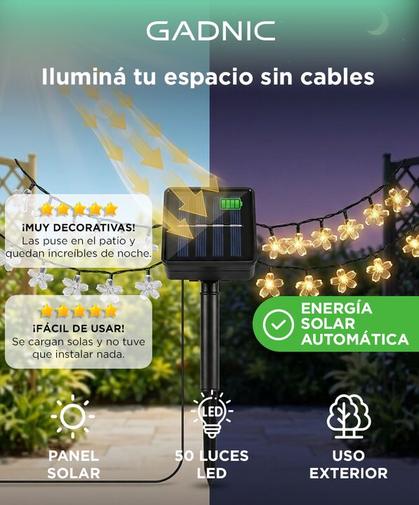 Iluminación sin cables con energía solar: La guirnalda GADNIC funciona con panel solar que permite su uso sin conexión eléctrica. Se carga durante el día y se enciende automáticamente por la noche. Diseño decorativo con flores de cerezo: Incorpora 50 luces LED distribuidas en 7 metros que generan un...