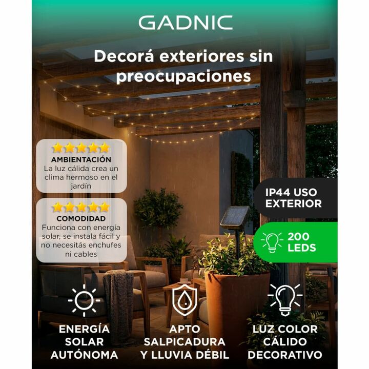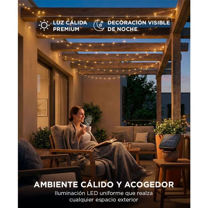 Iluminación exterior sin cables ni consumo eléctrico: La Guirnalda de Luces LED Solar de 20 metros funciona con energía solar, permitiendo decorar jardines, balcones o patios sin necesidad de enchufes ni instalaciones eléctricas. Apta para uso exterior real todo el año: Gracias a su protección IP44,...