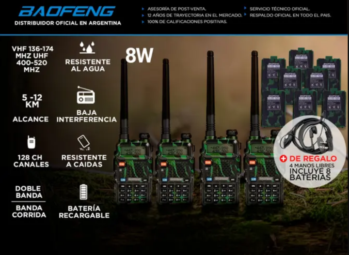Handy Baofeng UV-5R 8w Camuflado Bi-Banda Kit x4 Hasta 12km + 8 Baterías y 4 Manos Libres