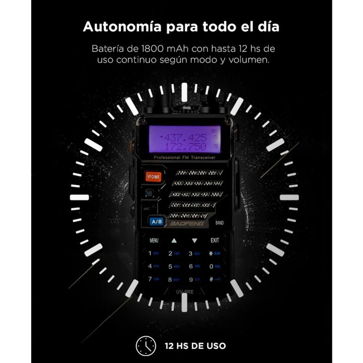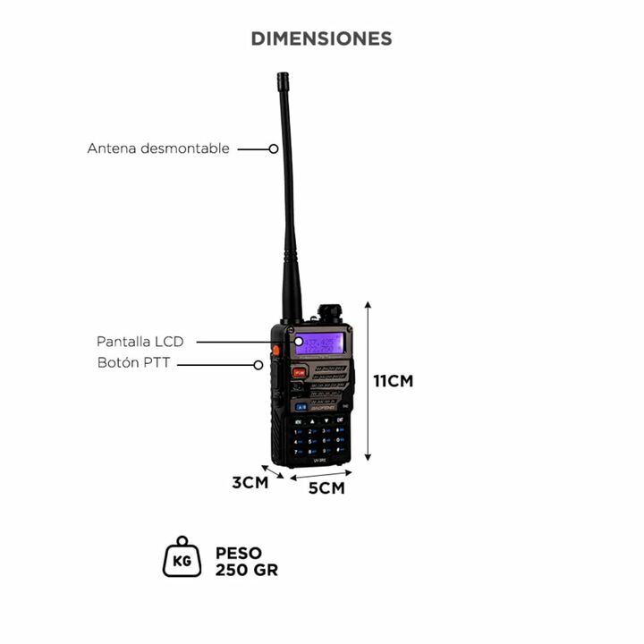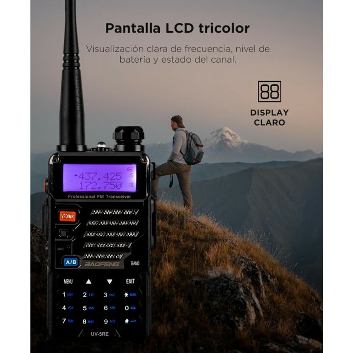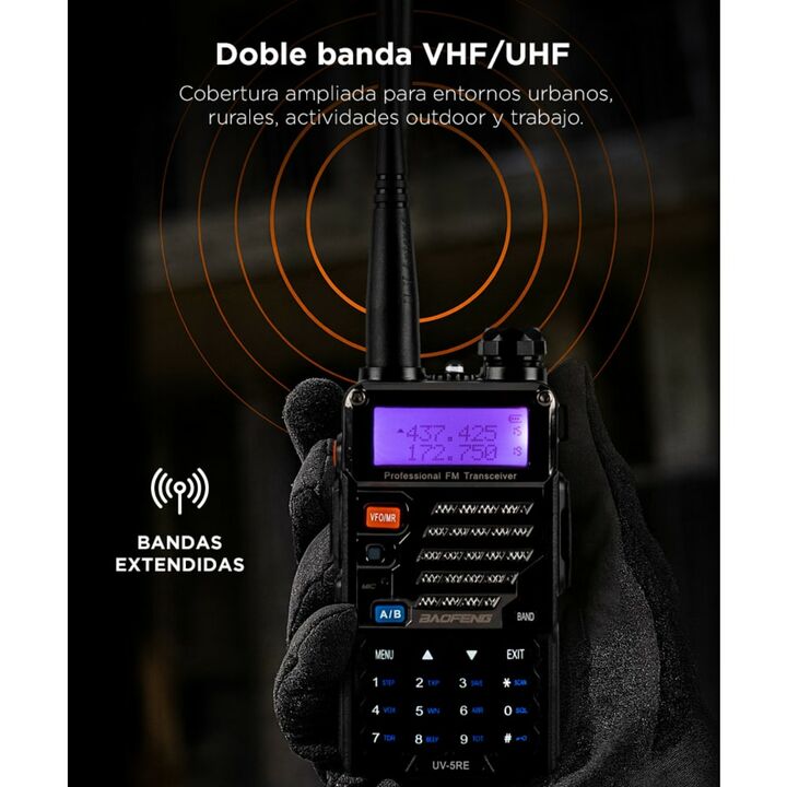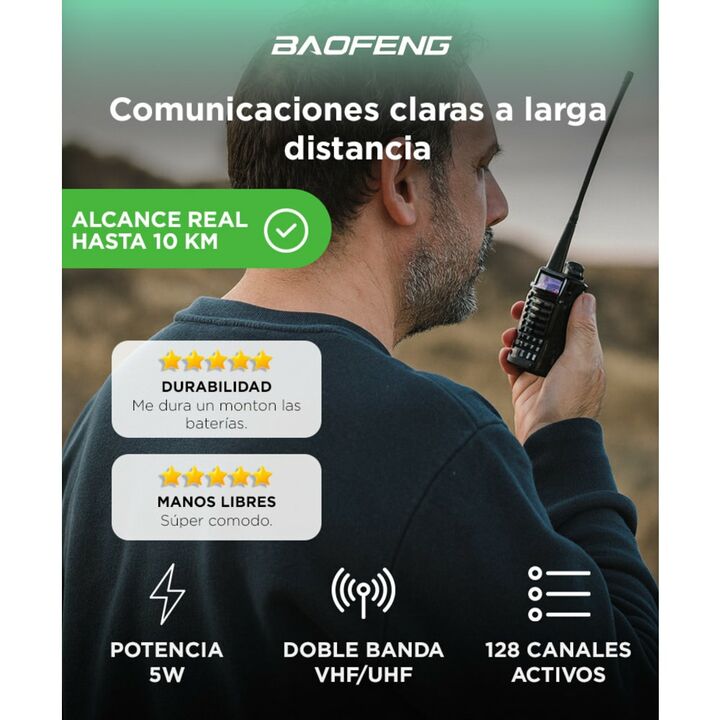 El Handy Baofeng UV-5R cuenta con doble banda y función dual standby, operando en un rango de frecuencia de 136-174 MHz y 400-480 MHz. Su rango de comunicación entre dos handys es de aproximadamente 5 a 10 km, lo que lo hace ideal para actividades en exteriores. Incorpora una pantalla LCD de 1,5 con...