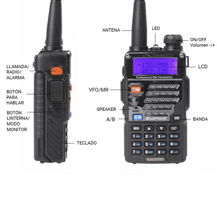 Especificaciones Doble banda/Dual Standby 136-174mHz / 400-520 mHz Rango de Comunicación (entre dos Handys) 5 a 10 km Aprox. Pantalla: 1,5″ LCD de tres colores Batería 7.4V 1800 mhA Autonomía de 12 hs. Potencia de salida: 5w Capacidad 128 Canales Separación entre canales: 2.5/5/6.25/10/12.5/20/25 Kh...