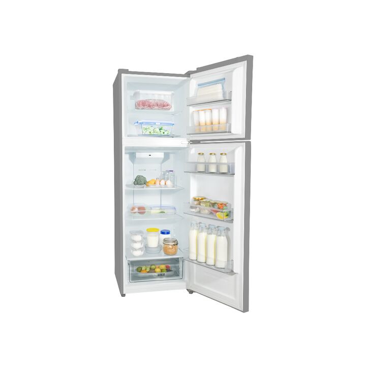 Heladera con freezeer superior con tecnología No-Frost. Construcción en material inteligente PCM. Puertas reversibles. Panel electrónico de control. Iluminación LED. Estantes de vidrio.