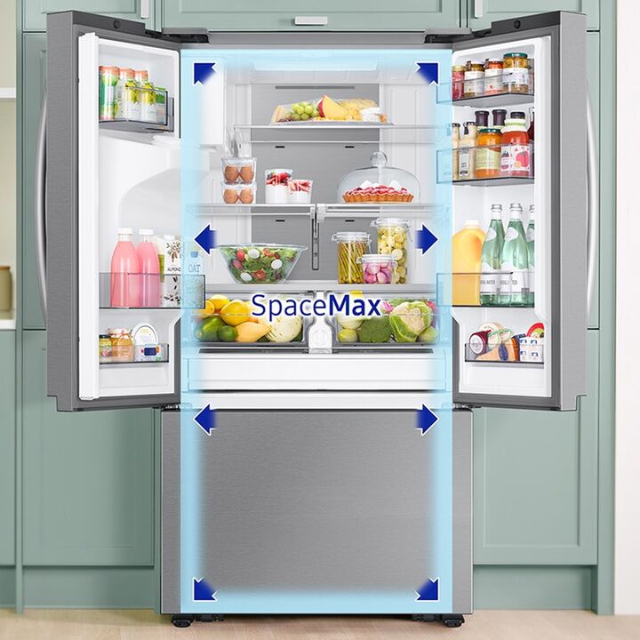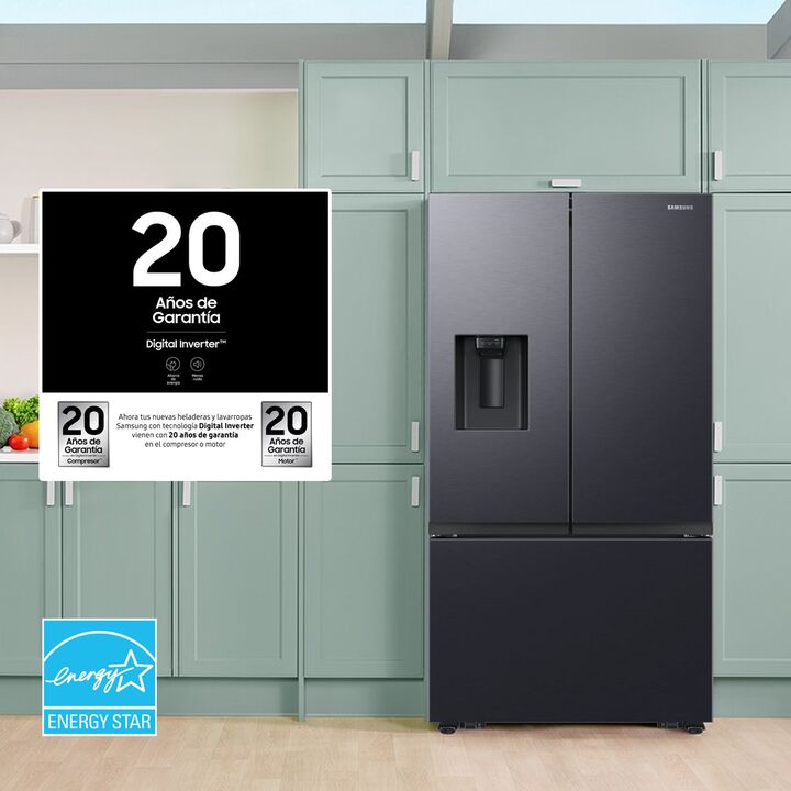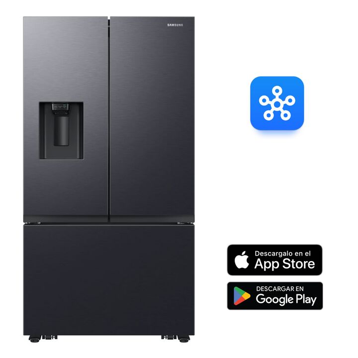 Dispenser agua y hielo | Fábrica de hielo automática | SmartThings (Android/iOS) | Digital Inverter | 859 L (867 L Bruta) | Eficiencia Energética A MÁS ESPACIO EN EL INTERIOR Almacená muchos más alimentos y accede a ellos fácilmente. Posee la mayor capacidad en heladeras Samsung de French Door (puer...