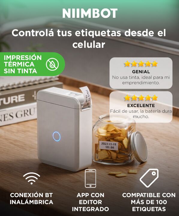 Control total desde el celular: La impresora etiquetadora portátil NIIMBOT D110 permite crear y editar etiquetas directamente desde el celular mediante su aplicación integrada. No requiere computadora ni configuraciones complejas, lo que facilita un uso inmediato. Impresión térmica sin tinta: Utiliz...