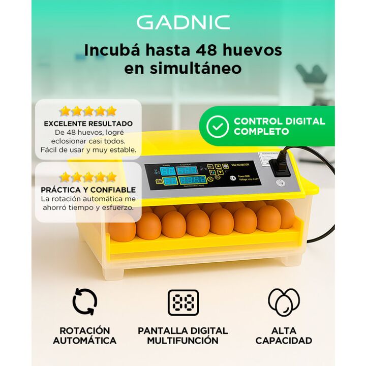 ¡Nueva Incubadora Automática Gadnic! Esta máquina incubadora de aves de corral ofrece más espacio para un total de 48 huevos para incubar. Es extremadamente fácil de usar, más fácil de limpiar y más versátil que otras incubadoras más pequeñas. La pantalla LED permite el ajuste de la temperatura y un...