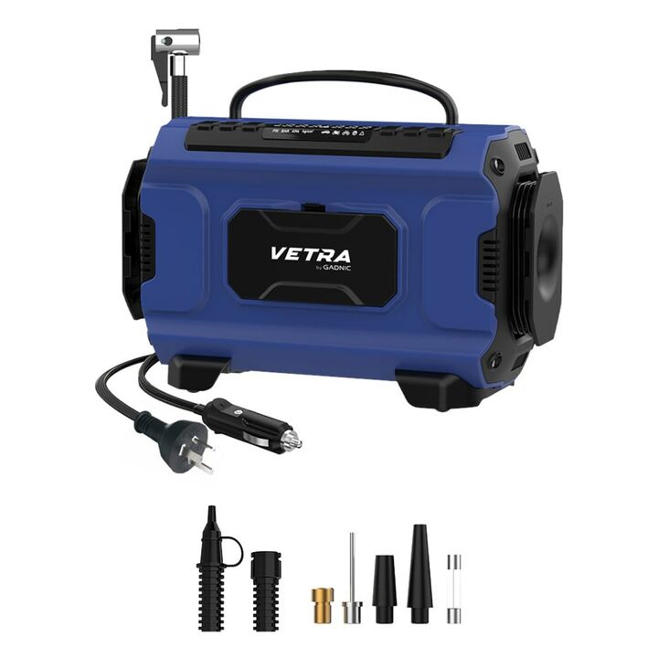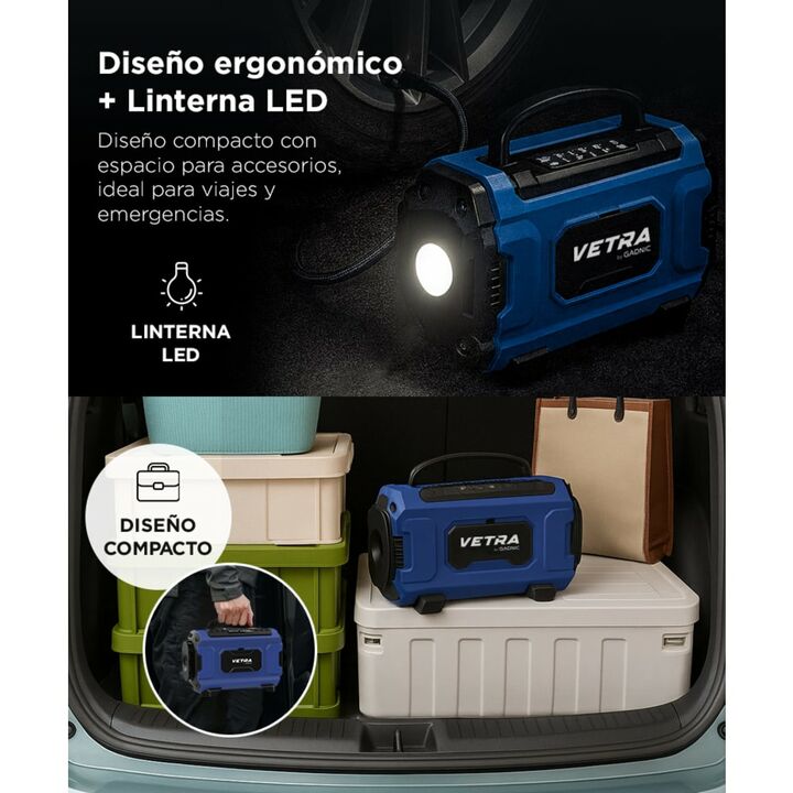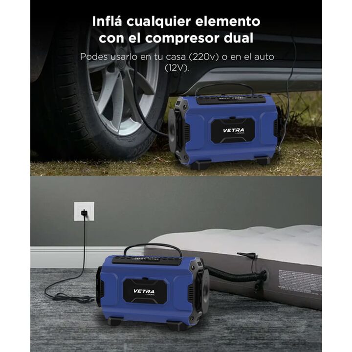 Potencia y precisión en cualquier situación El inflador portátil Vetra by Gadnic de ciento cincuenta PSI brinda la potencia necesaria para ajustar la presión de autos, motos, bicicletas y artículos deportivos. Su pantalla LCD permite seleccionar la presión deseada con exactitud y su apagado automáti...