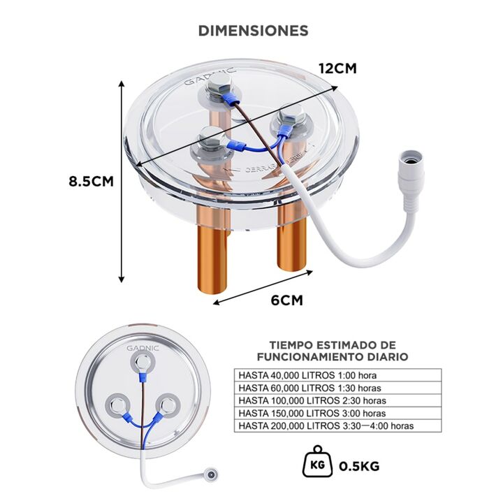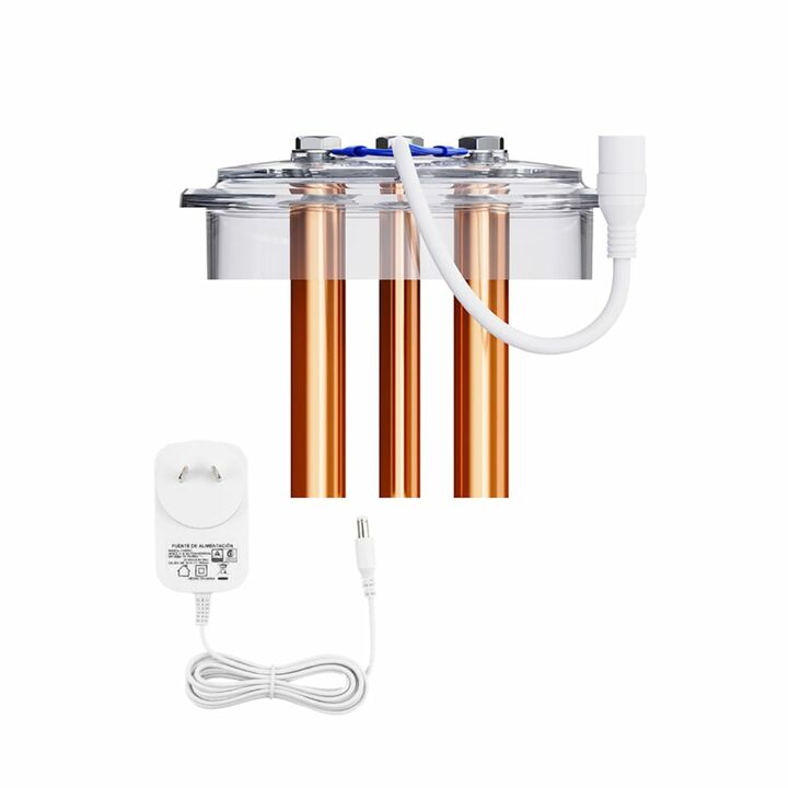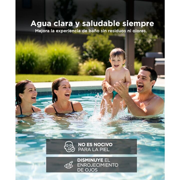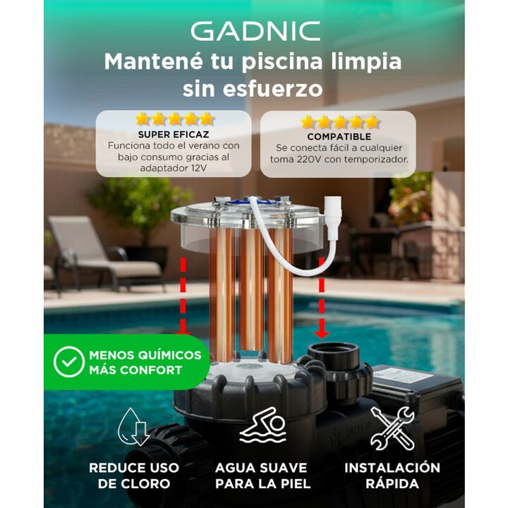 Ionización de cobre potente: Purificación continua con electrodos de cobre que eliminan bacterias y algas sin dañar el agua. Menos productos químicos: Disfrutá agua clara sin exceso de cloro, ideal para piel sensible y niños. Fácil instalación plug & play: Conectalo a la bomba y toma 220V con tempor...