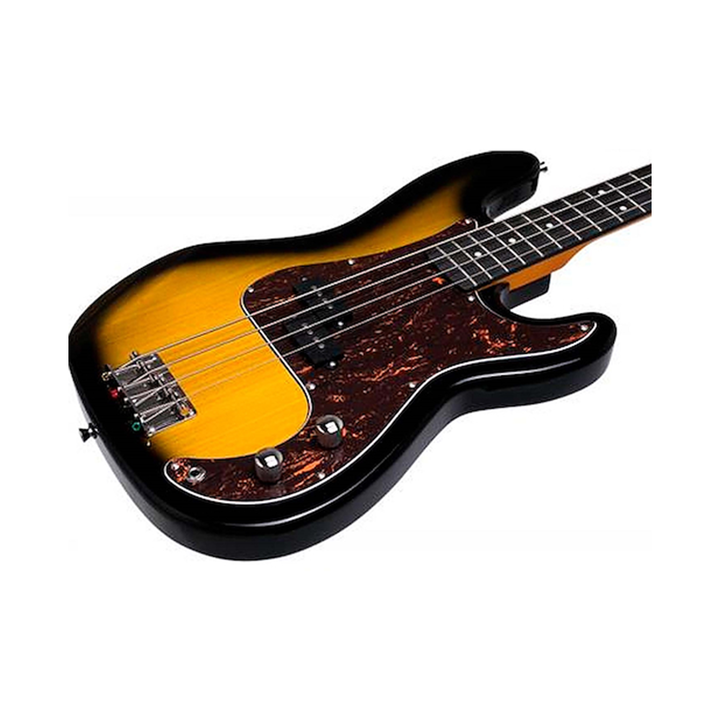 Bajo Precission, cuerpo sólido, mástil de maple, diapasón de rosewood, pick-up dividido, 1 controlador de Volumen y 1 de Tono y clavijas cromadas.Sunburst
