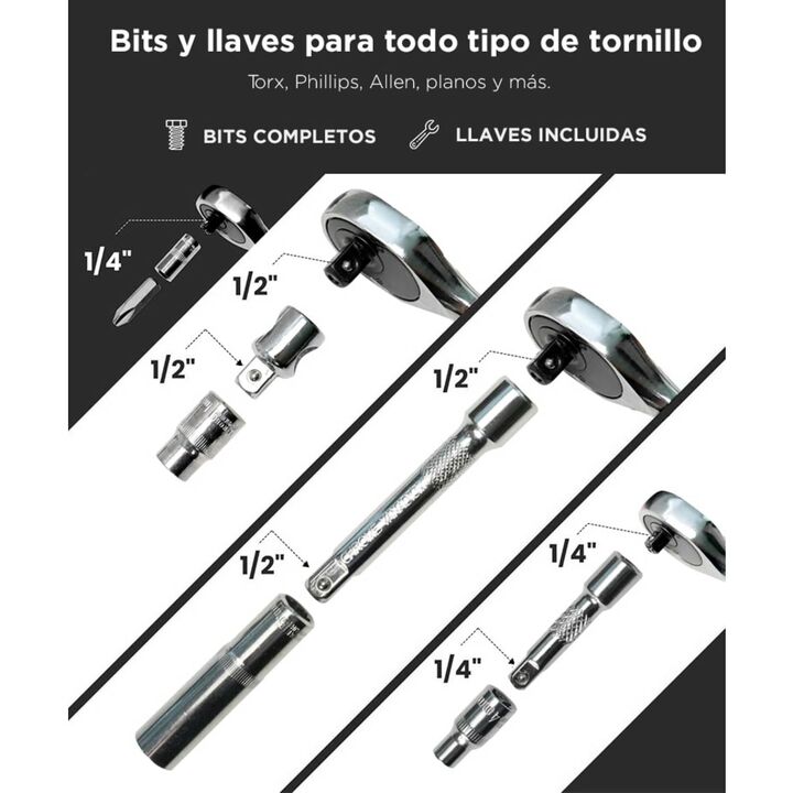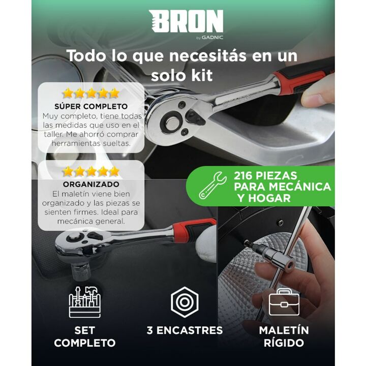 Set completo de 216 piezas para múltiples tareas El Kit de Herramientas Bron By Gadnic reúne tubos, llaves y accesorios para mecánica, mantenimiento y uso general en un solo maletín. Tres encastres para máxima versatilidad Incluye encastres de 1/2”, 3/8” y 1/4”, cubriendo desde trabajos livianos has...